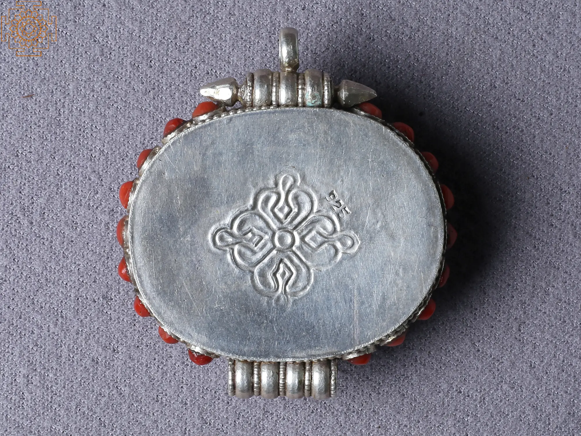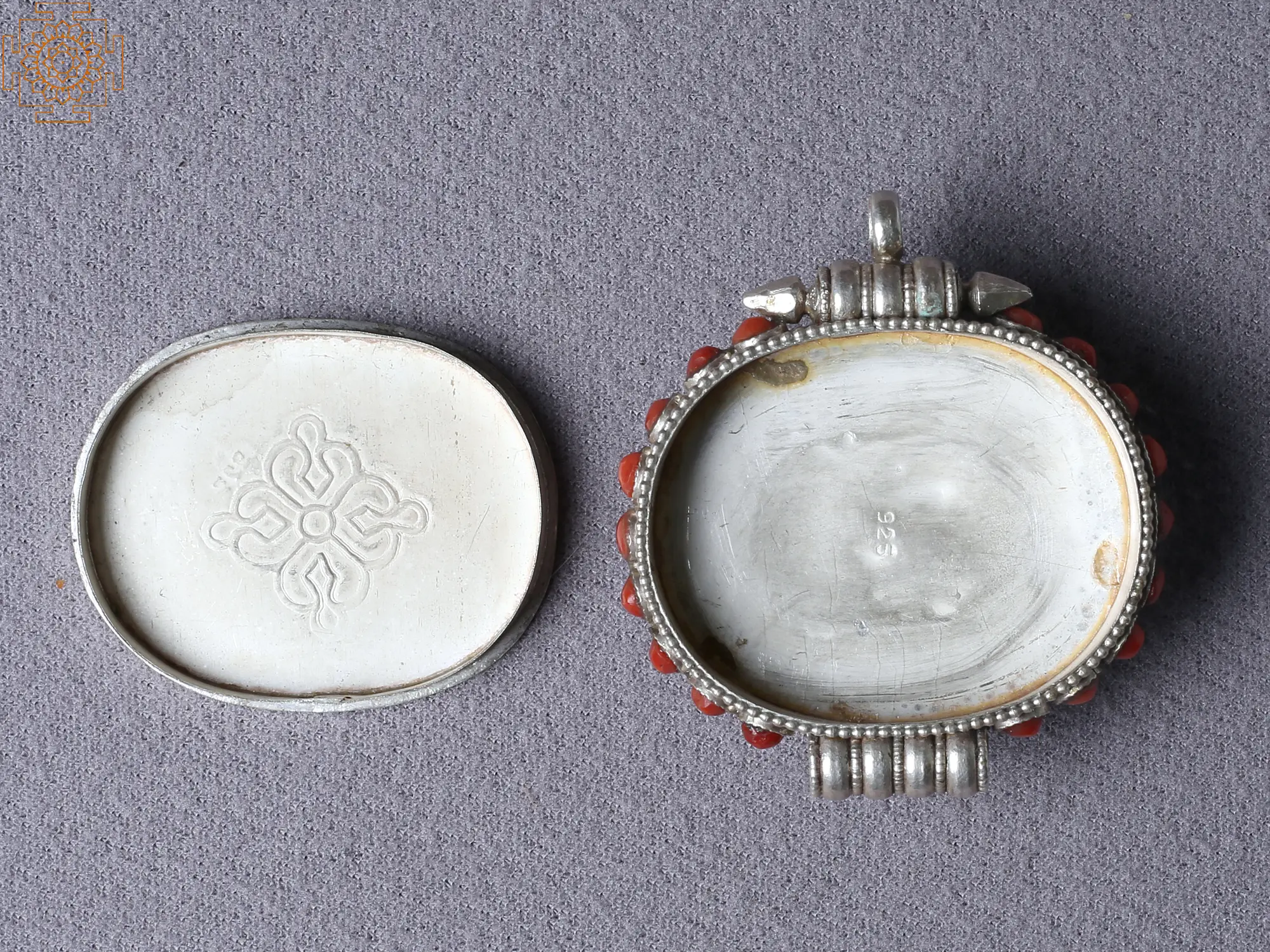 The pendant is a classic Ghau design that features a little pocket to hold prayer scrolls. To further emphasize the object's holiness, the pendant has a double Dorje emblem on the reverse. They are merely plain pieces of jewelry when worn without the prayer scrolls, but when blessed with the scrolls they become a divine medium to connect with the almighty.