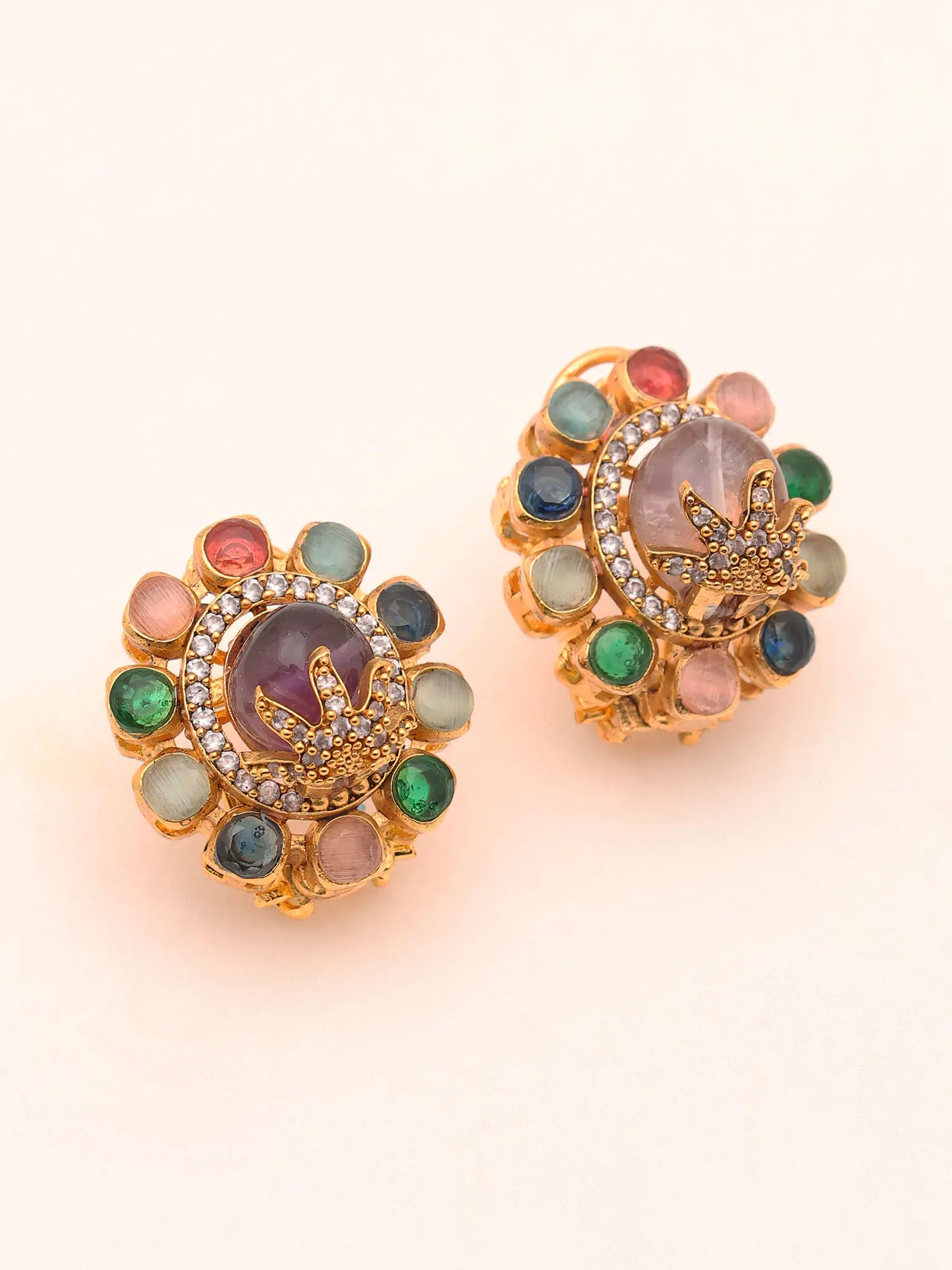 The earrings feature a captivating blend of gemstones, including vibrant emeralds, deep sapphires, rich rubies, and delicate moonstones. These stones are expertly set around a central sunstone, creating a dazzling floral pattern. The meticulous placement of each stone ensures a harmonious balance of color and light, creating a truly mesmerizing effect. The glistening sunstone at the center adds a touch of warmth and luminosity, enhancing the overall beauty of the piece.