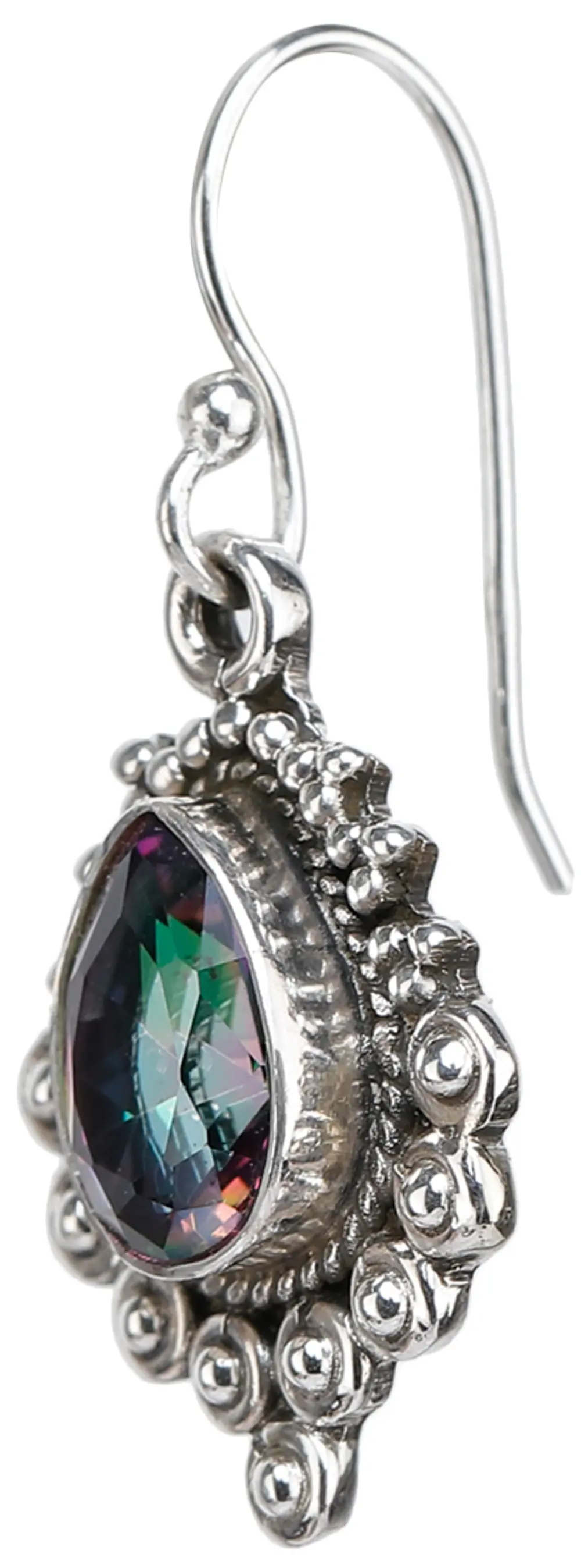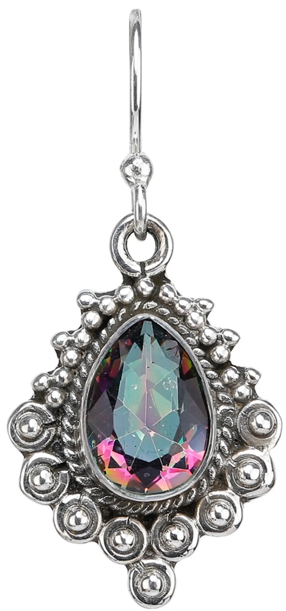 Discover a truly captivating pair of earrings that shimmer with an otherworldly allure. These exquisite drops are designed to capture the light and your imagination, featuring stunning Mystic Topaz gemstones. Each pear-shaped stone is a marvel of nature and artistry, displaying a mesmerizing play of colors that shift and dance with every movement. From deep blues and vibrant greens to fiery purples and rosy pinks, the spectrum of hues within each gem is simply breathtaking, evoking the magic of a twilight sky or the iridescent shimmer of a peacock feather.