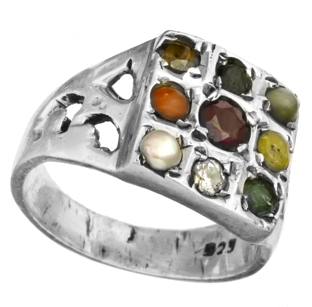 Each setting is meticulously crafted from sterling silver, a metal chosen for its lustrous sheen and inherent durability. The design showcases an arrangement of nine distinct gemstones, each carefully selected and set by skilled artisans. You'll appreciate the testament to traditional craftsmanship, where every detail reflects a dedication to excellence and a deep respect for the materials.