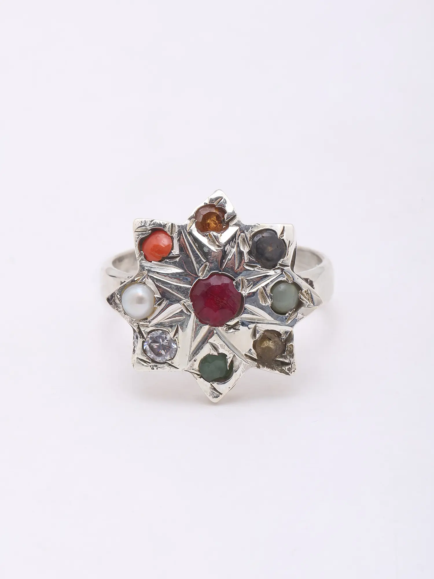 Navaratna Stone Studded Eight-Pointed Floral Brooch