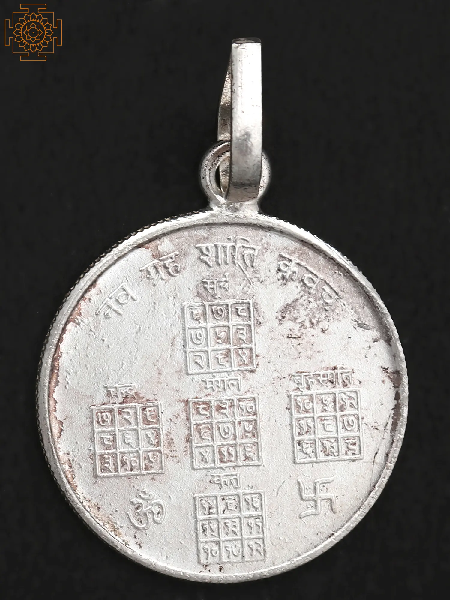 The Navagrahas or nine planets in Indian Astrology hold a very significant place in a person's life. Their movement is believed to control the well-being of human beings. Another aspect of the Navagrahas is that their behavior also brings malicious effects on the lives of humans. To eradicate the negative effect people are advised to chant the Navagraha Kavacham or use the Navagraha Yantra. This silver pendant is blessed with the Navagraha Kavacham. Navagraha Kavacham translates to "Armour of the Nine Planets." This pendant with the blessing of the Kavacham shields us from the unfavorable impacts of planets in our lives and grants us success in all aspects.