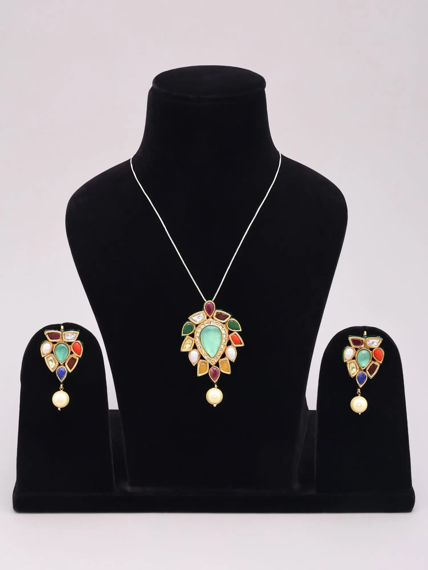 Navratna Pendant and Earrings Set with Kundan Work and Floral Design