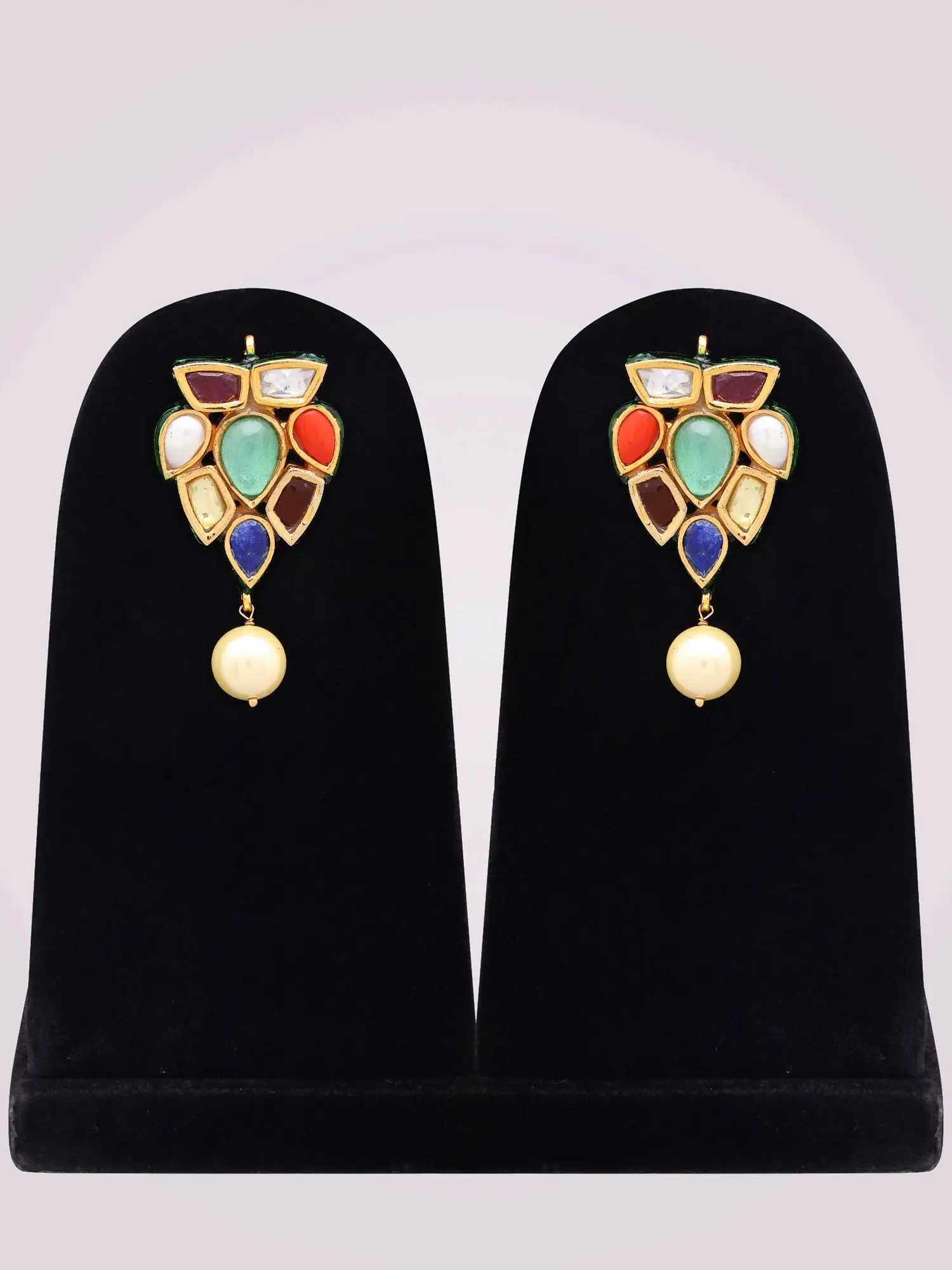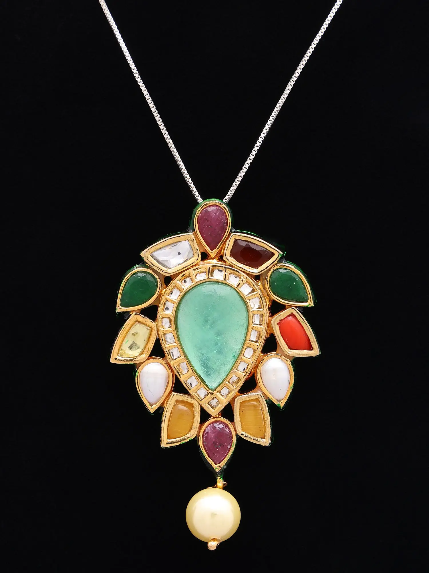 Rooted in the rich cultural heritage of Navratna tradition, this set embodies the belief in the auspicious significance of nine celestial gems. For generations, such intricately crafted pieces have been worn as symbols of prosperity, well-being, and cosmic harmony. Wearing this set connects you to a lineage of discerning individuals who understood the profound beauty and spiritual resonance of these sacred stones.