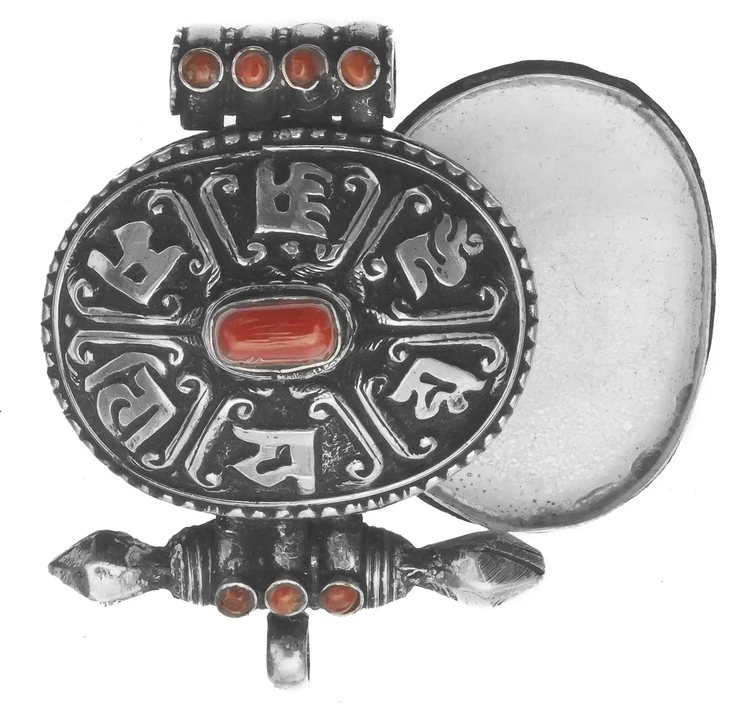 This pendant carries the echoes of Tibetan Buddhist traditions, specifically representing the mantra "Om Mani Padme Hum." This revered mantra is central to the practice of compassion and wisdom, and the symbols etched here are the Sanskrit script of this profound utterance. Such pieces are often worn as talismans, offering protection and spiritual guidance to the wearer.