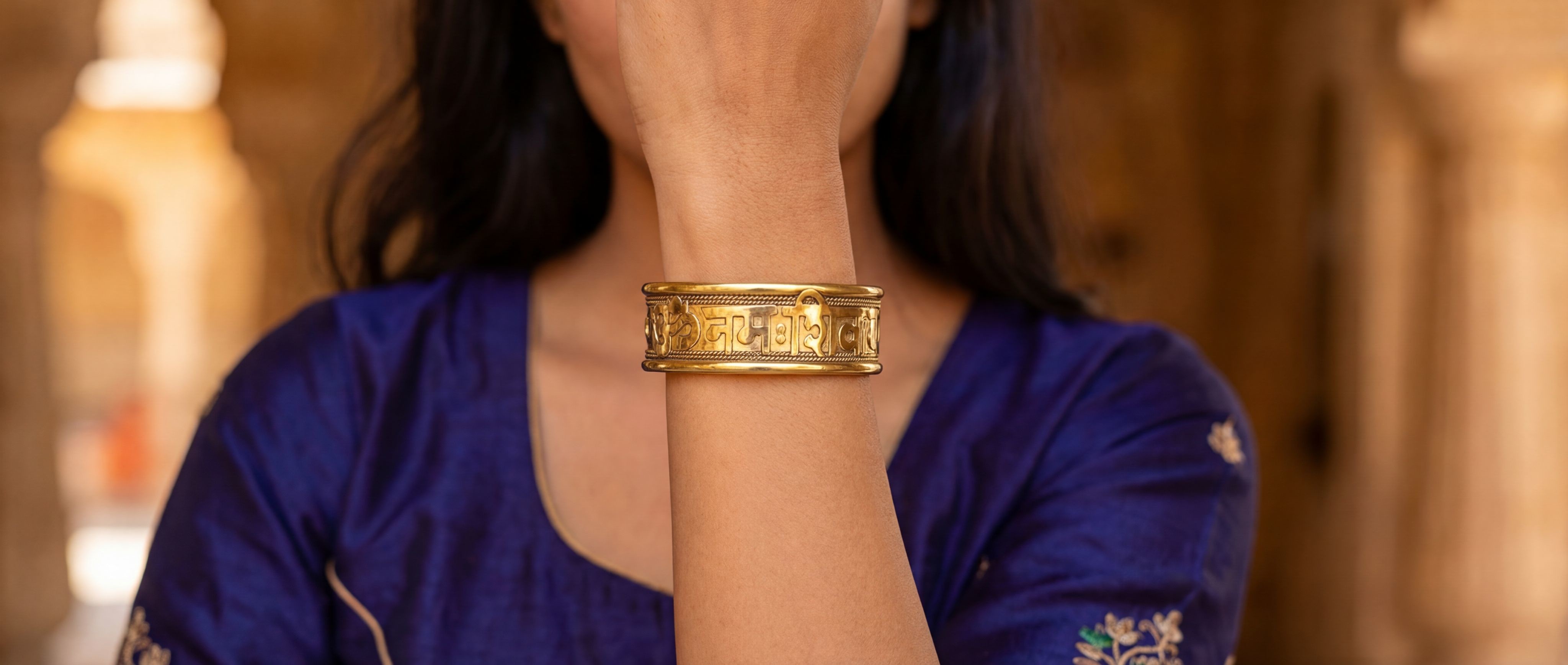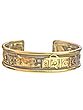 This brass kadaa / bracelet is believed to relieve arthritis, enhance sleep, increase energy and promote better blood circulation due to the words etched on it. It also gives positivity in daily routine life. The richness of the bracelet earthen hues, along with gold plating, give this bracelet its premium. It can be used as daily wear and partywear.