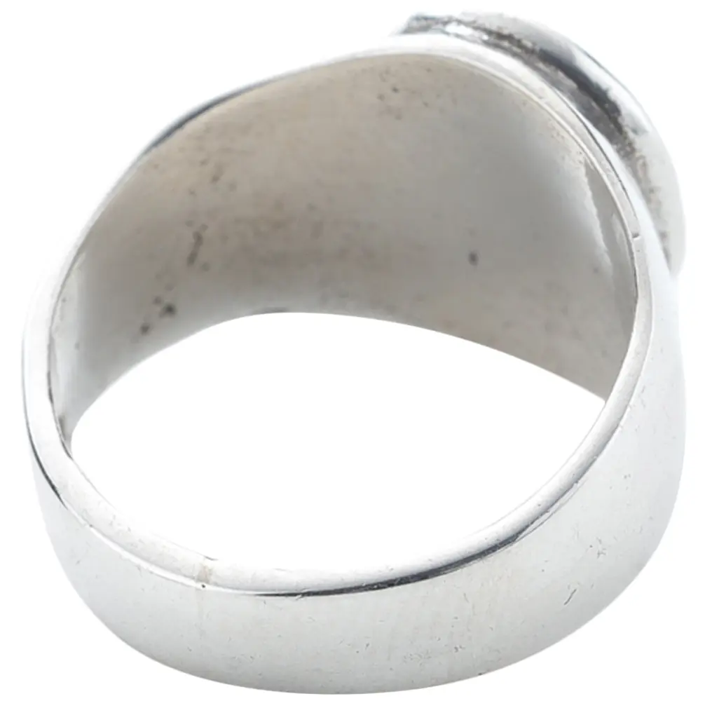 The focal point of this ring is a beautifully rendered symbol, carefully set within a circular frame. The raised design, measuring 5 mm in height, offers a subtle yet impactful presence on your finger. Its polished surfaces contrast with the deeper tones within the intricate design, creating a captivating visual depth that draws the eye.