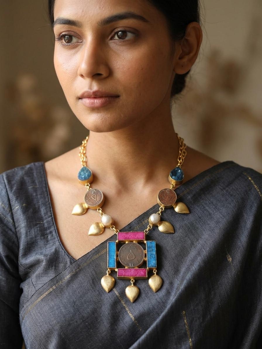 Each component of this remarkable necklace is a testament to meticulous skill. Crafted from lustrous brass, the foundation provides a warm, enduring glow. The central coin, a genuine 50 Baisa from Oman, is carefully integrated, showcasing its intricate engravings. Leaf-shaped gold-tone drops, meticulously formed, add a delicate, organic dimension. Hand-set azure blue and vibrant fuchsia stones frame the centerpiece, accentuating its historical significance and adding a pop of color.