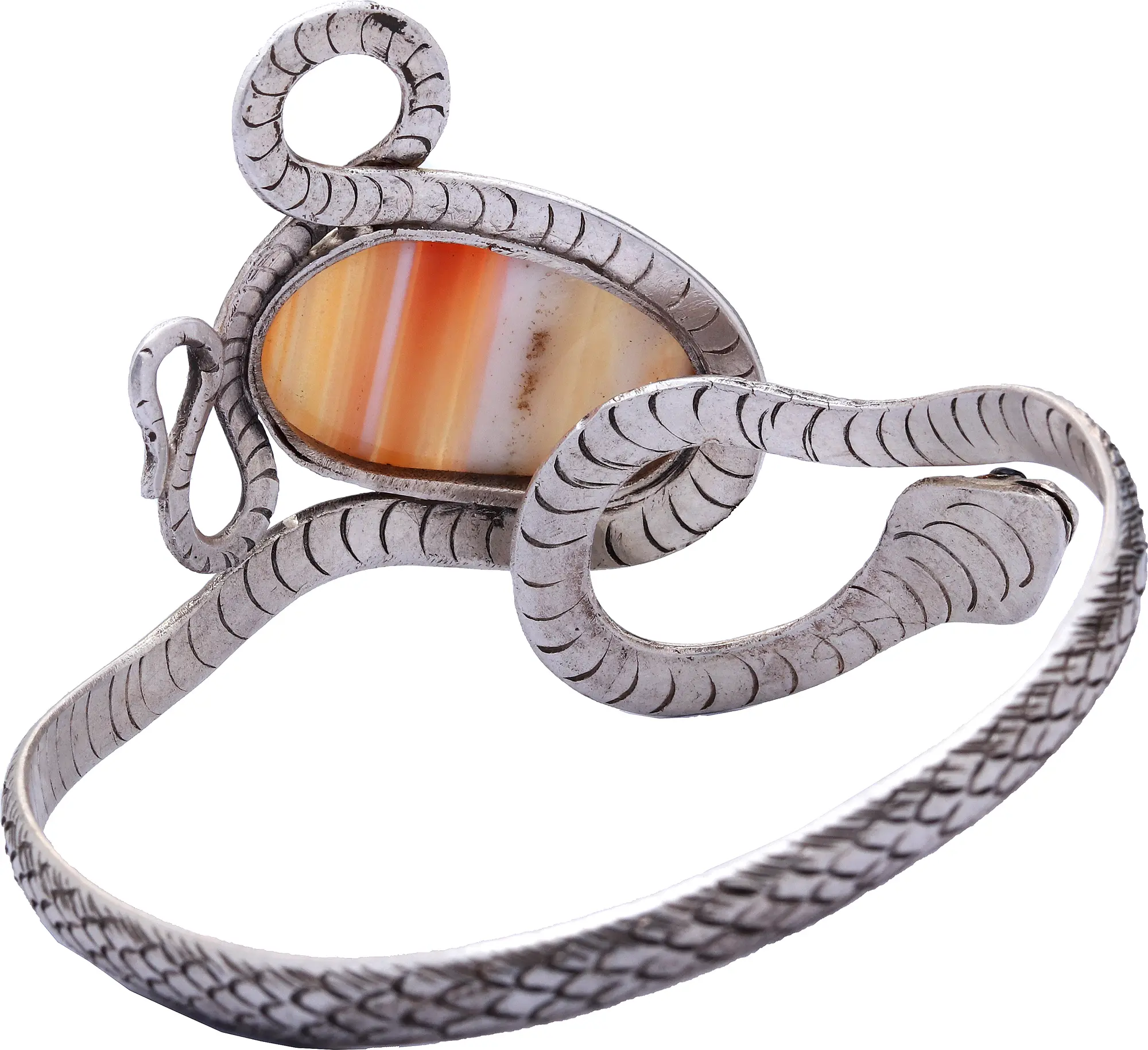 At its heart lies a captivating gemstone, its milky white depths shot through with streaks of warm amber and soft peach. This striking agate, smoothly polished to a high sheen, offers a mesmerizing visual journey within its banded interior. The roughly 2.7-inch diameter of this significant centerpiece ensures it remains the focal point, a harmonious contrast to the intricate silverwork.