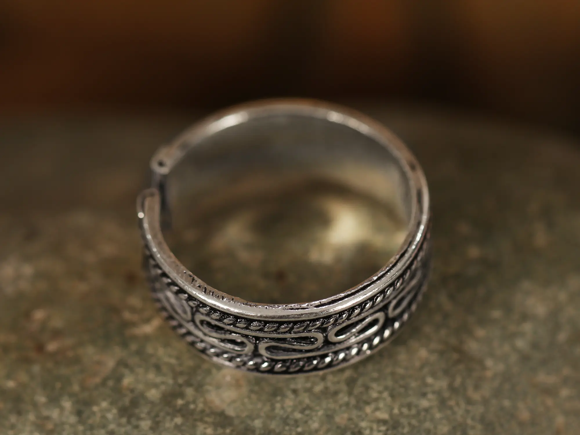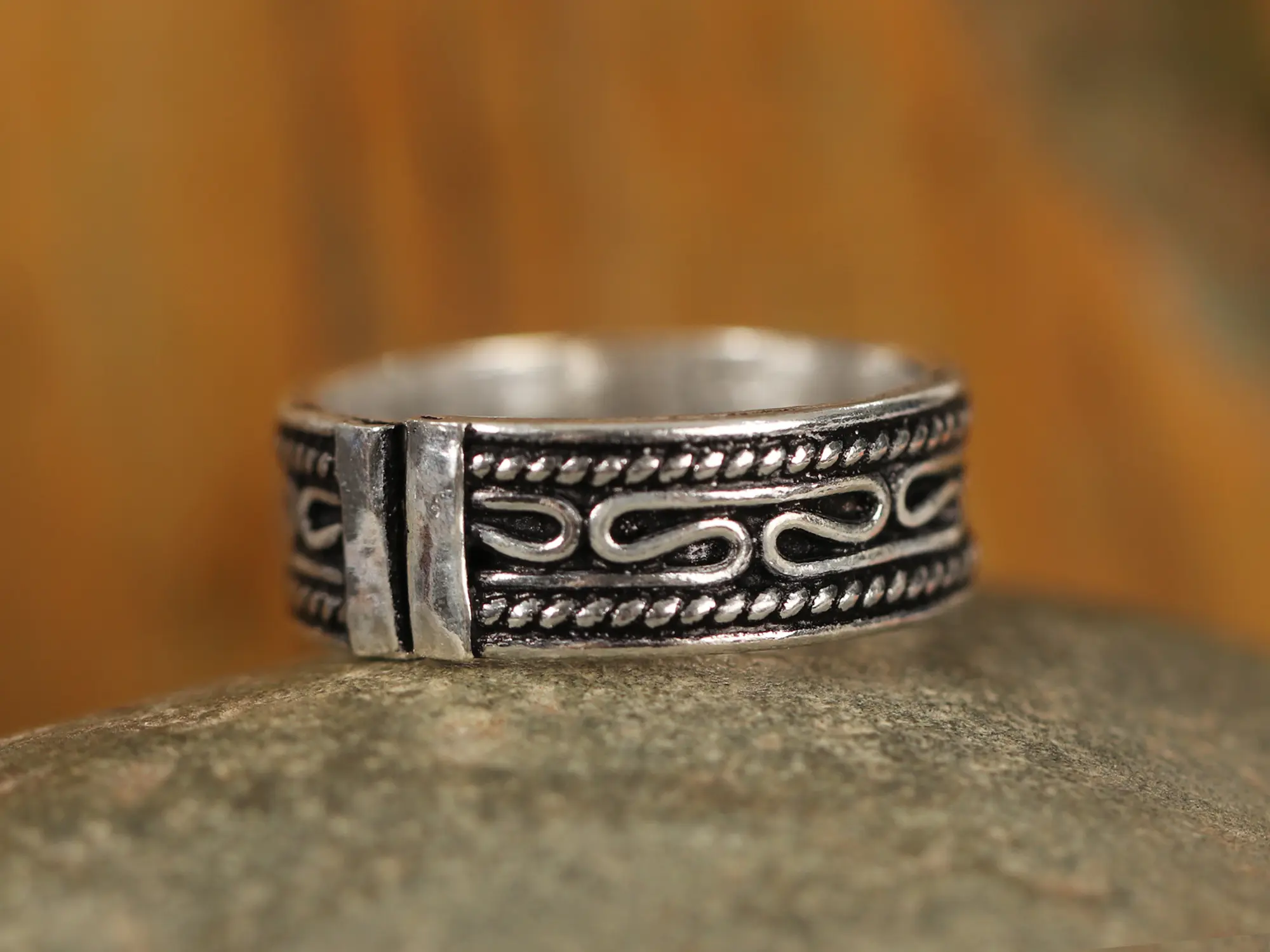 This Open-Patterned Ring made of sterling silver is a tribute to the rock music culture. Archers first used these rings, and they were then popularised by the Rock Musicians, especially the guitarists. The design of this ring is taken further with the addition of tribal designs inside the ring's frame. The sediments around the design are artificially created to give the ring an antique look. This ring might look like a small accessory, but is a very important part of pop fashion.