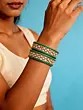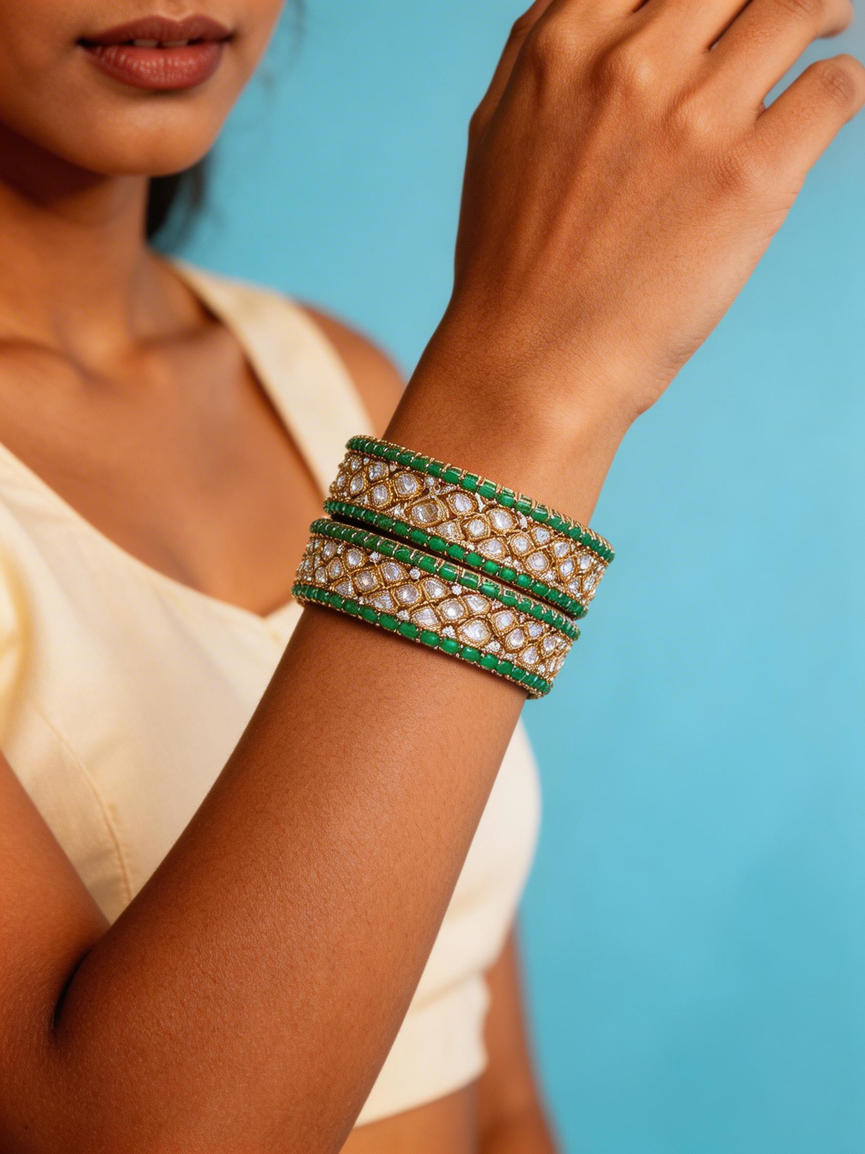 Each bangle is meticulously crafted from quality brass, chosen for its rich tone and enduring nature. The intricate setting of Polki stones, with their characteristic uncut facets, creates a dazzling play of light. Accented with vibrant emeralds, these pieces showcase an artisanal approach that honors traditional jewelry-making techniques. You'll appreciate the detailed filigree work and the secure clasp, designed for both beauty and practicality.