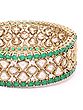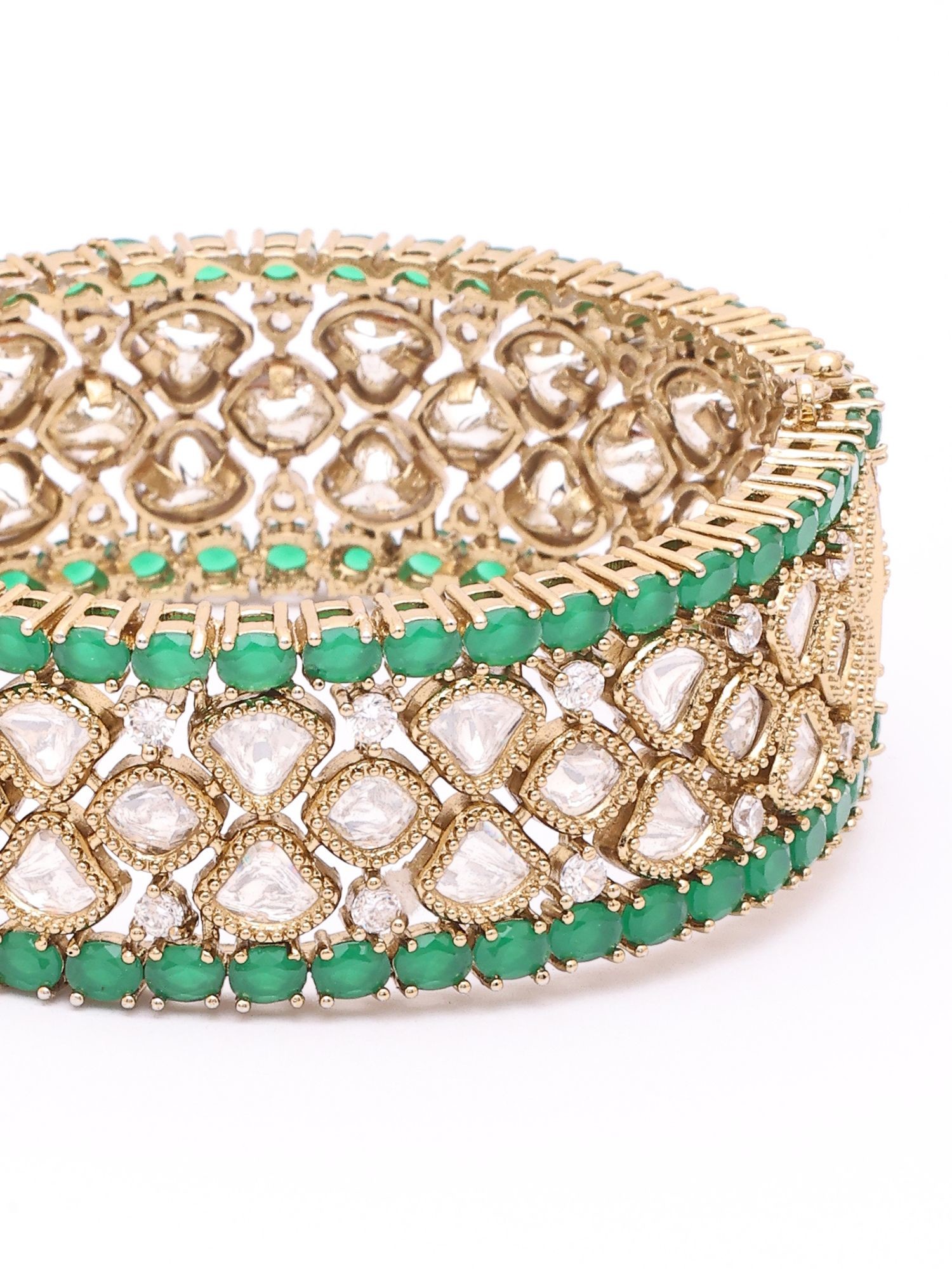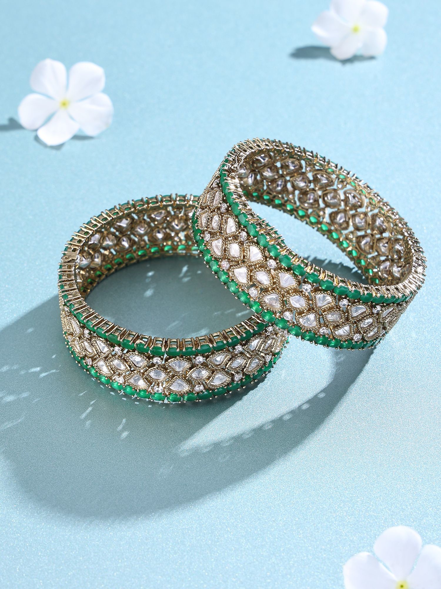 The surface of each bangle boasts a rich tapestry of clear, diamond-like Polki stones, arranged in a complex, geometric pattern that exudes vintage charm. These are beautifully framed by a delicate border of brilliant emerald stones, adding a captivating splash of color. The substantial width of 1.95 inches ensures these bangles command attention, while their height of 0.95 inches provides a comfortable yet impactful presence on your wrist.
