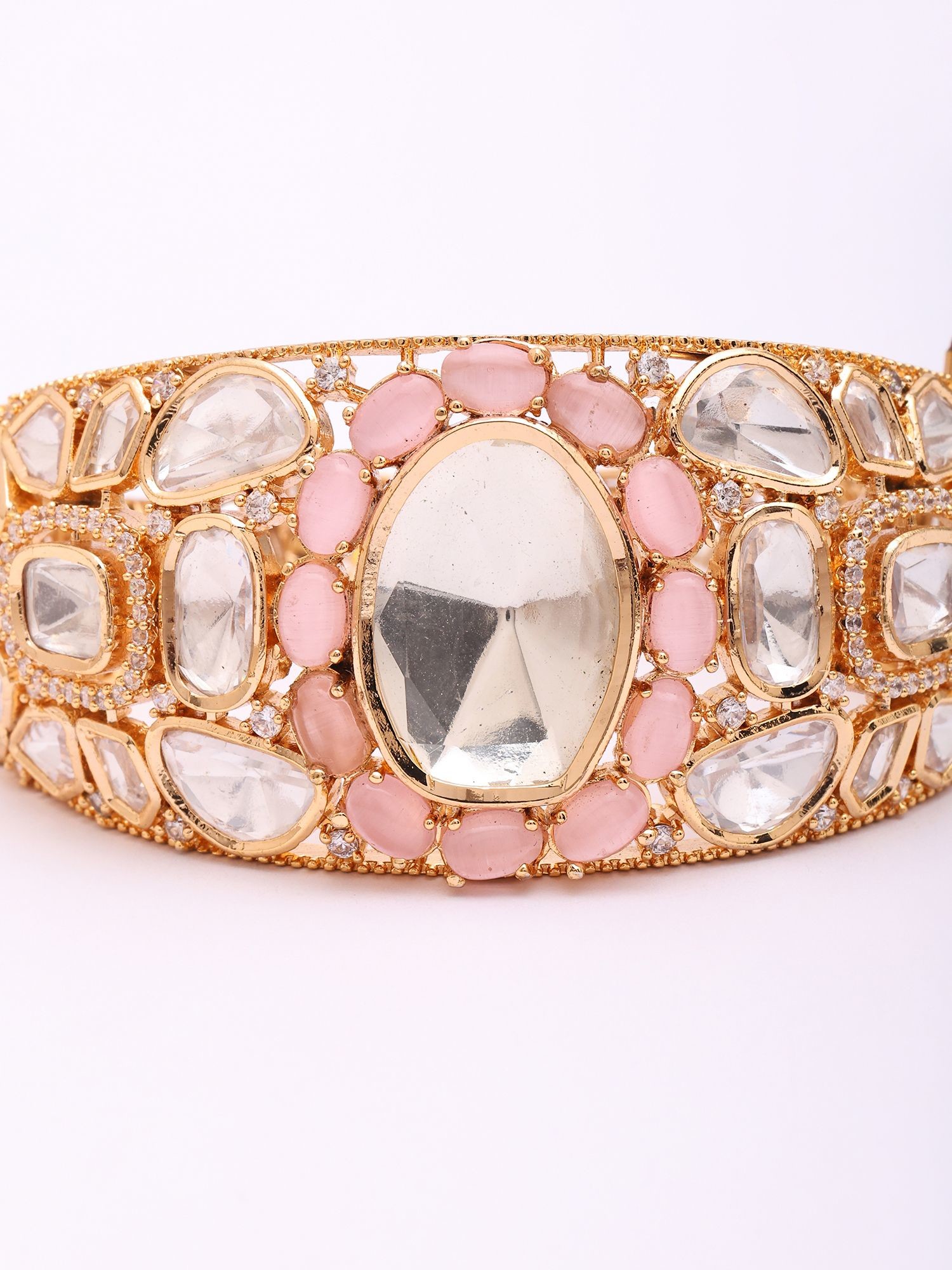 The captivating centerpiece features a striking central stone embraced by a halo of delicate blush pink polki stones, exuding a gentle, sophisticated glow. Surrounding this alluring arrangement, a constellation of clear, faceted stones adds unparalleled brilliance, scattering light with every subtle movement of your hand. This openable cuff design ensures a comfortable and secure fit, with an inner diameter of 1.1 inches in height and a width of 1.9 inches, making it a graceful addition to your collection.