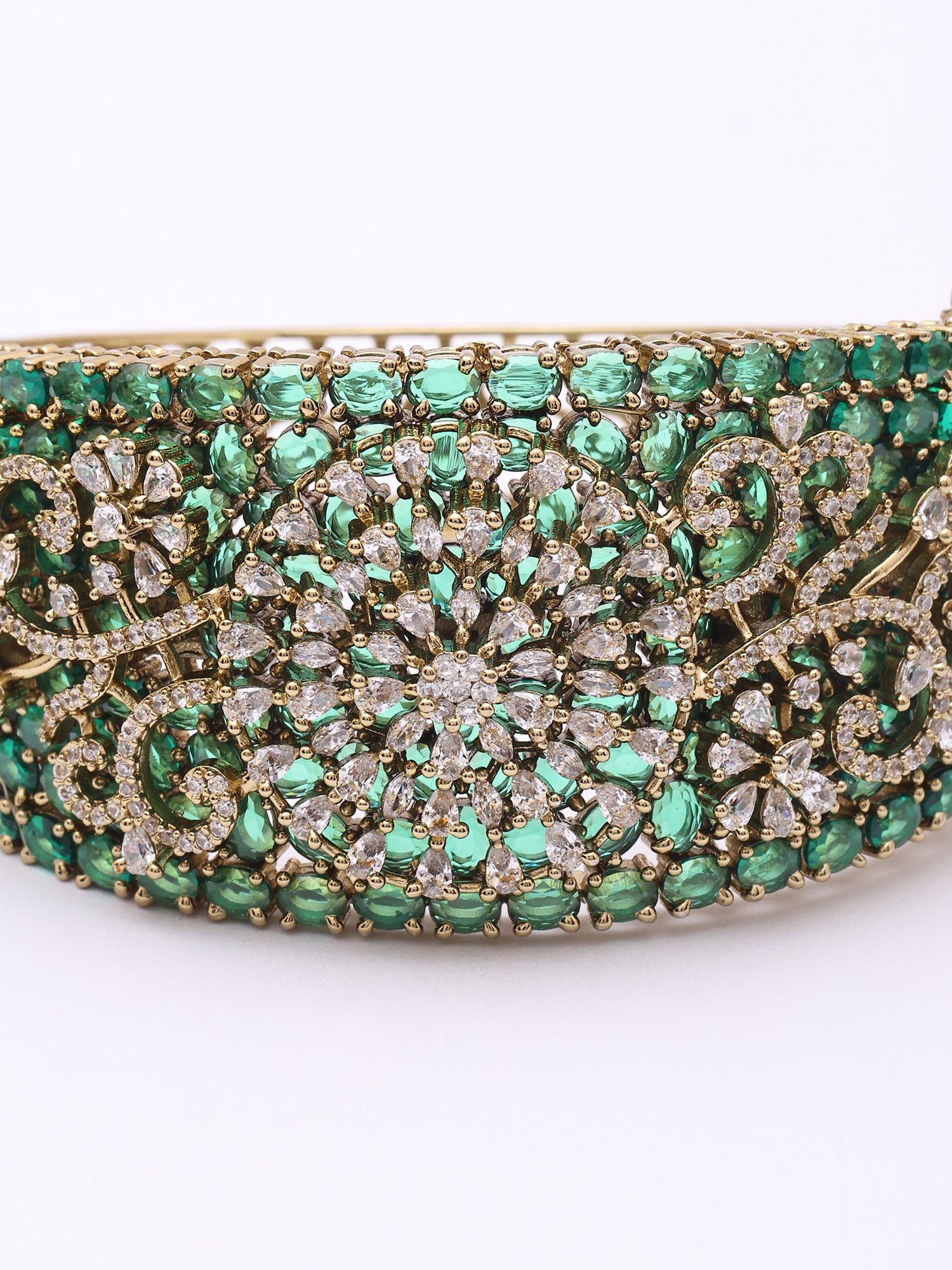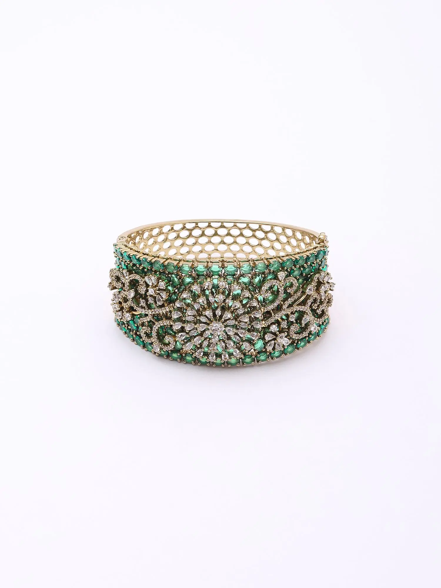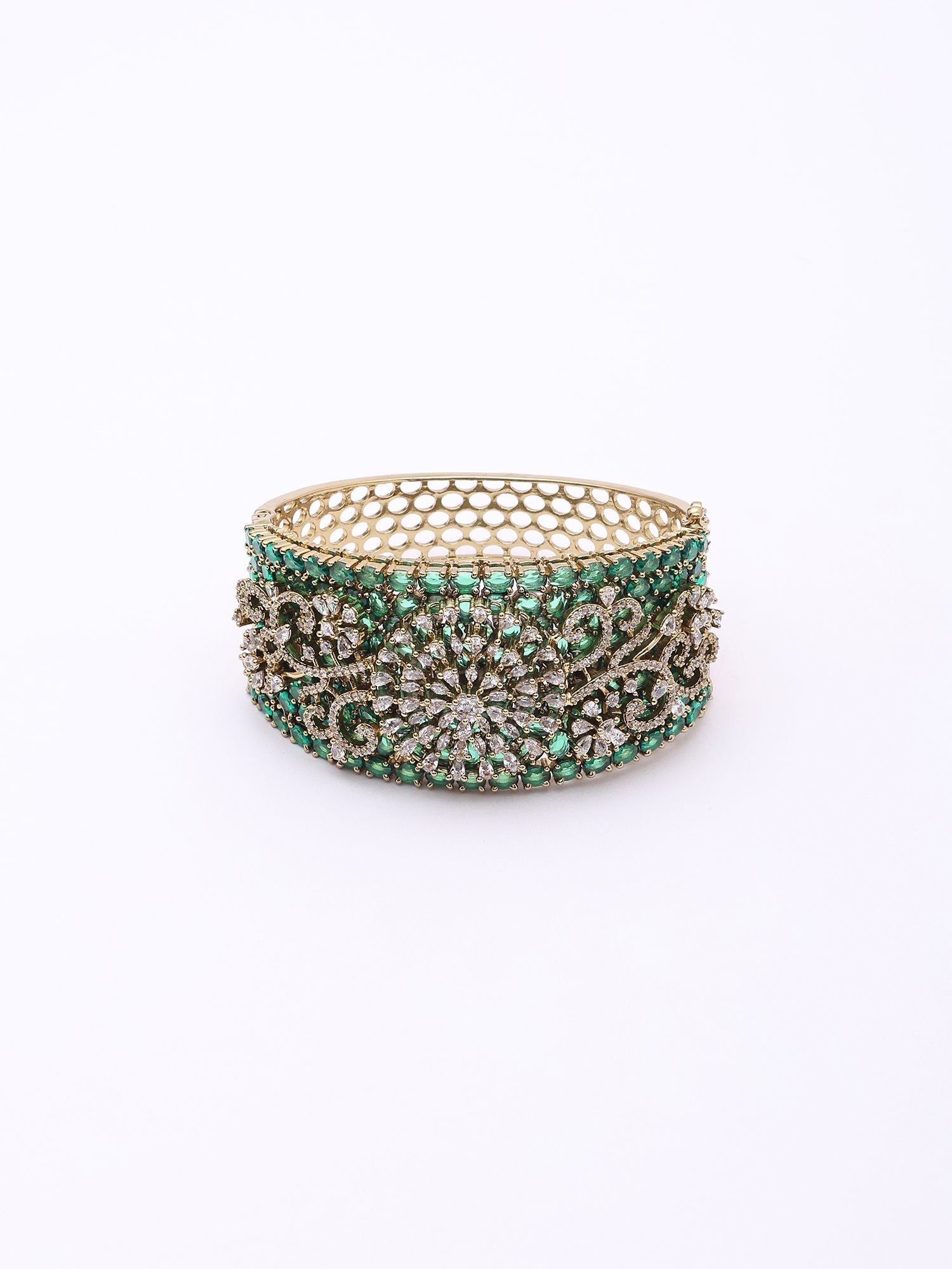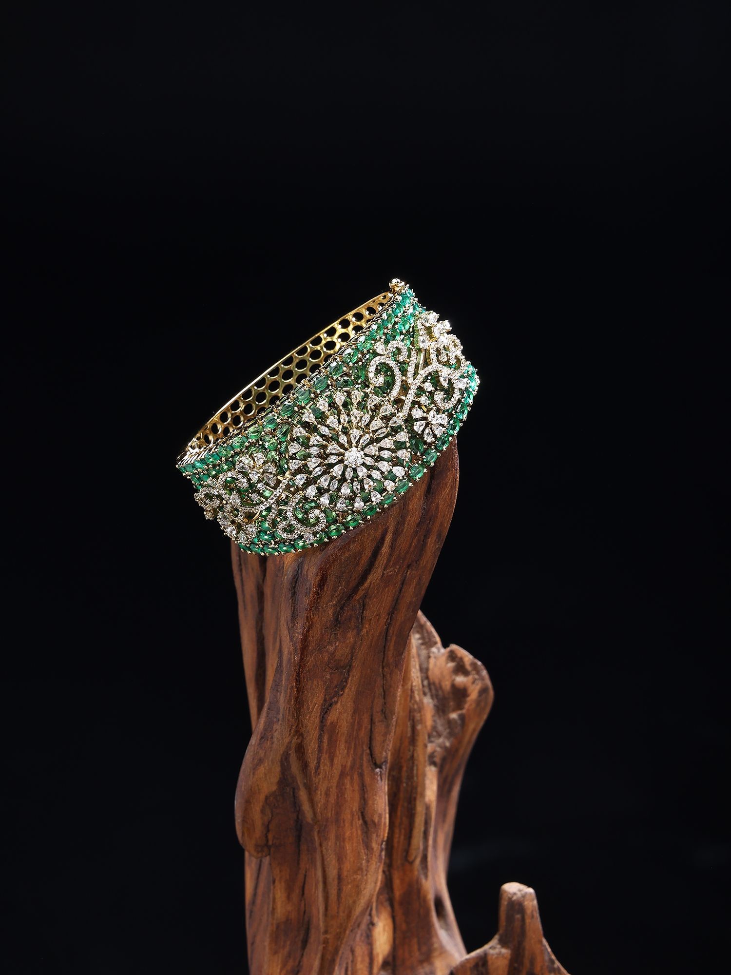 Each detail of this remarkable cuff is a testament to artisanal mastery. Crafted from lustrous brass, it is meticulously adorned with a captivating array of American diamonds and vibrant emerald stones, meticulously set to create a breathtaking floral motif. The openable design ensures comfortable wear, while the precision of its construction speaks volumes about its inherent quality and the dedication poured into its creation.