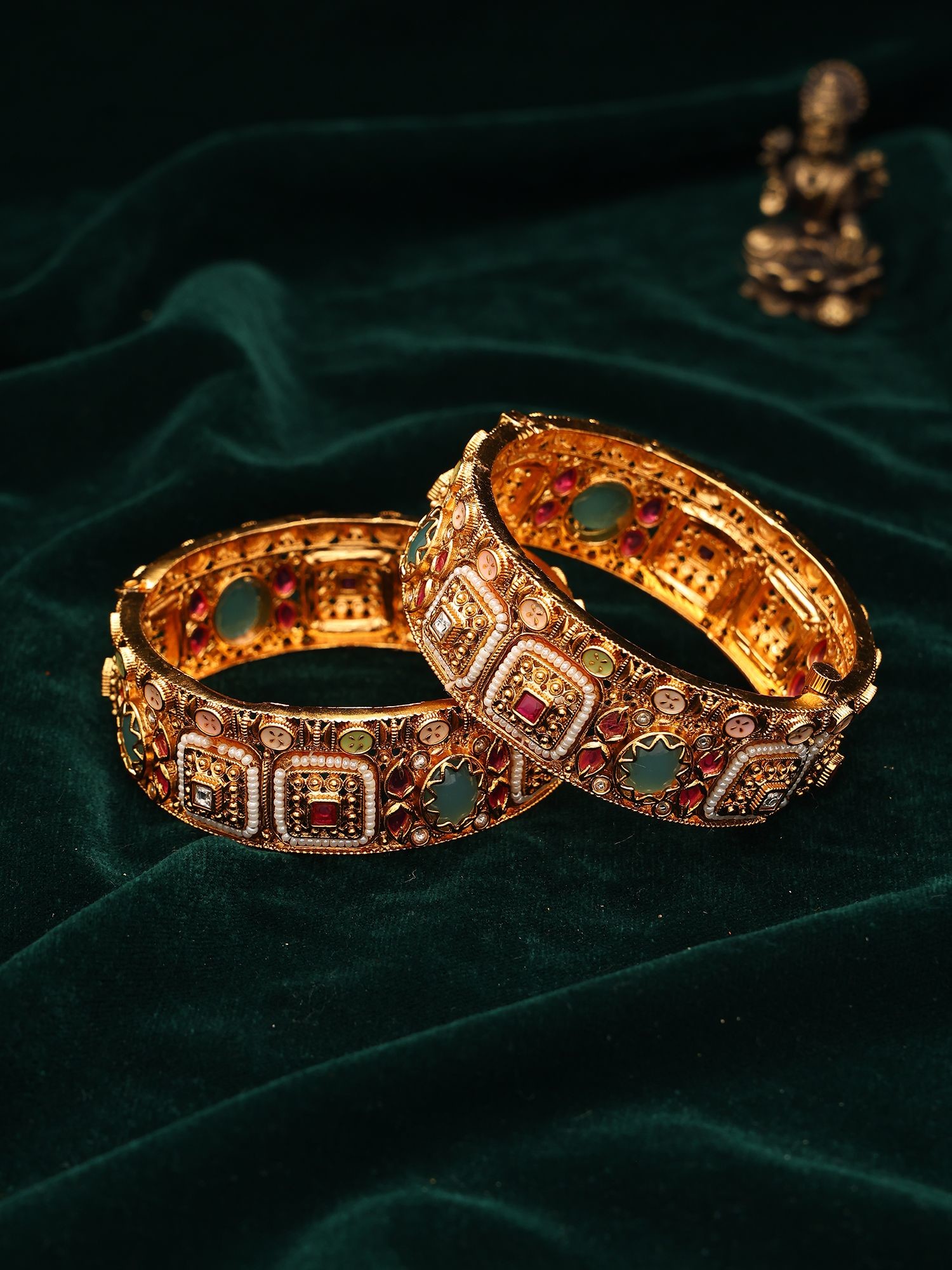 Elevate your ensemble with a touch of regal splendor, as you embrace the exquisite artistry of these handcrafted bangles. Designed to capture attention and evoke a sense of refined elegance, they are the perfect complement to occasions demanding sophisticated flair. Prepare to be captivated by their intricate beauty and the stories they tell.