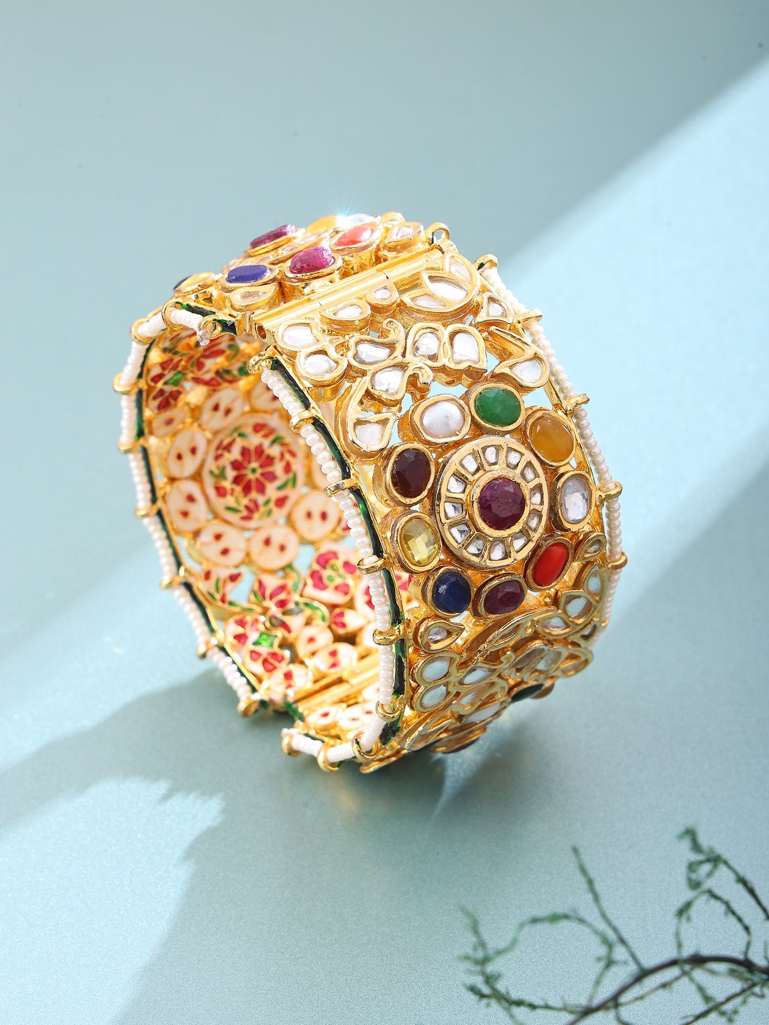 Openable Lacquer Bangle with Kundan Detailing and Navratna Stones