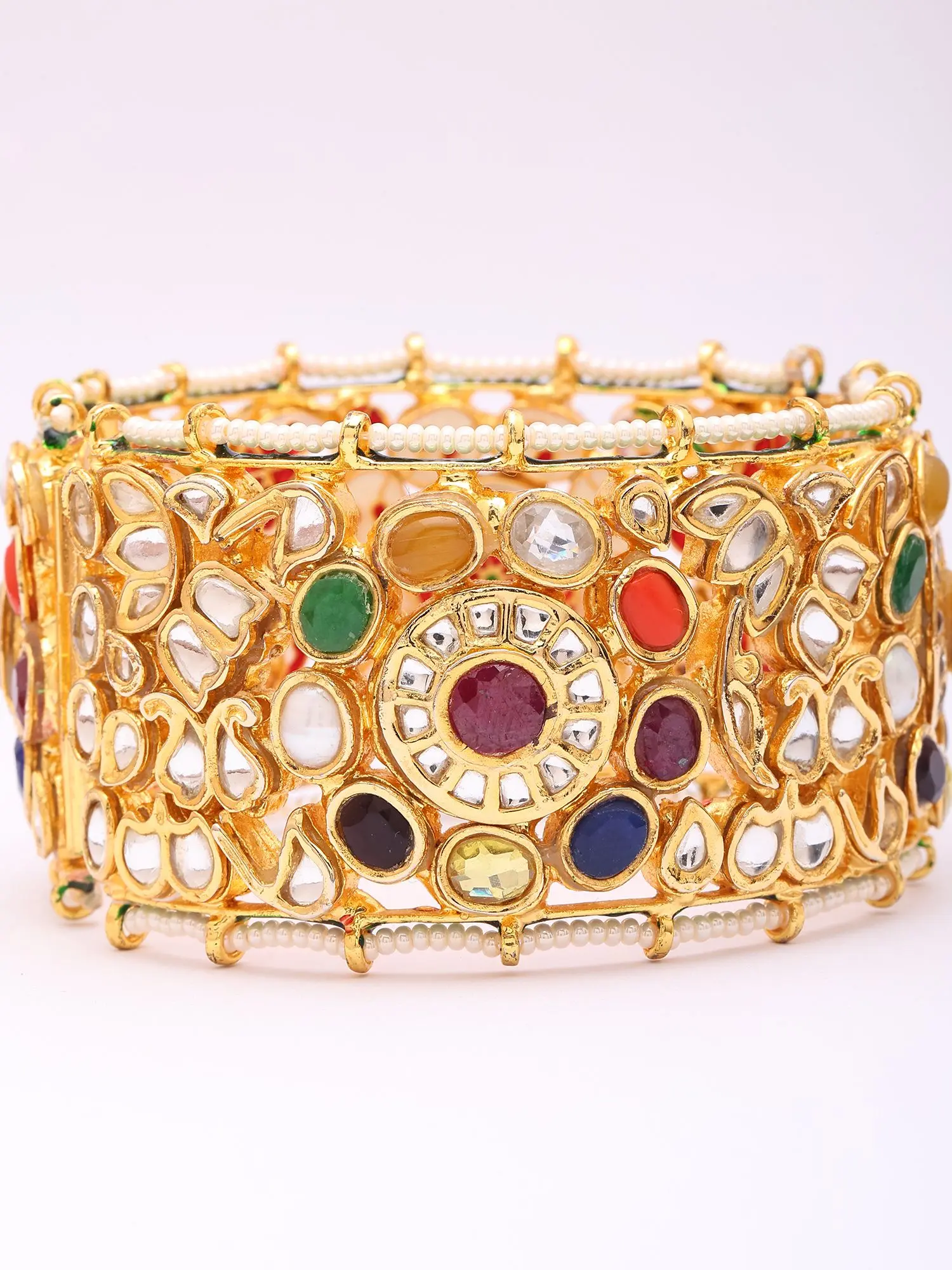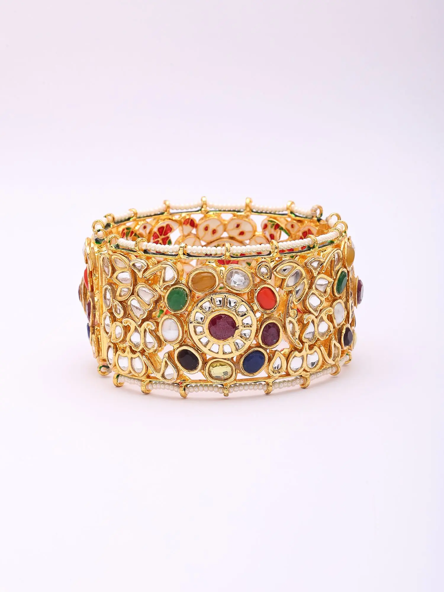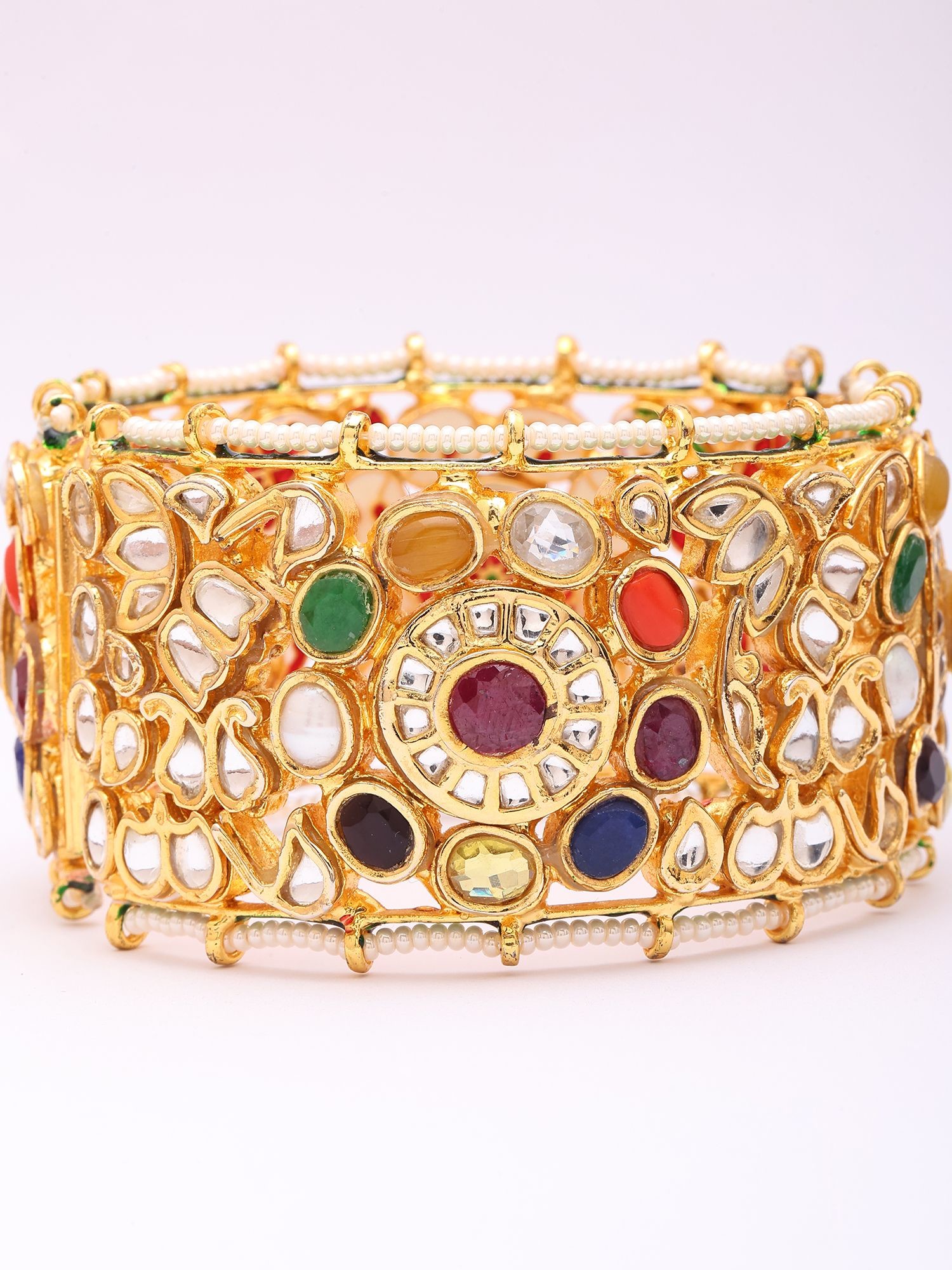 Beyond its luminous lacquer backdrop, the cuff is adorned with the auspicious Navratna stones, representing nine celestial bodies, each imbued with symbolic meaning. The clear, bright Kundan stones capture and reflect light, enhancing the allure of the colorful gemstones, while delicate pearls gracefully line its edges, adding a touch of refined elegance. Its width of 1.5 inches makes a bold yet balanced statement, with an inner diameter of 2.5 inches ensuring a comfortable, secure fit.