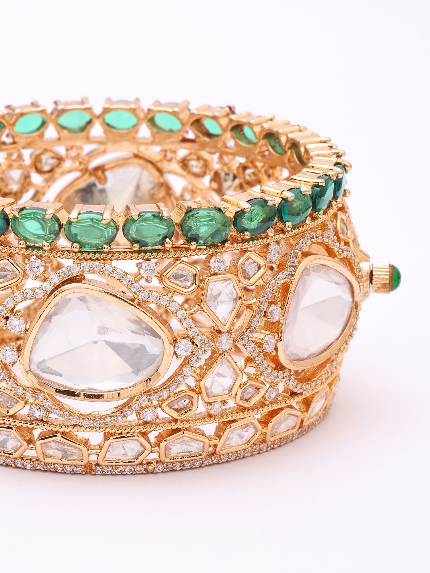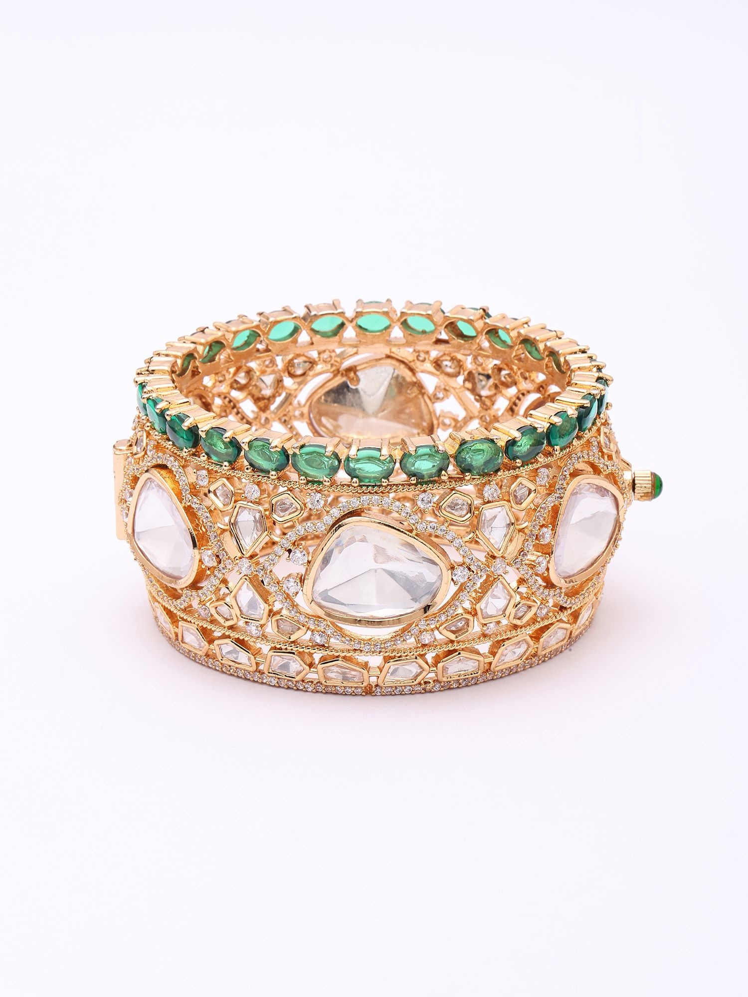 Behold the brilliance of precisely cut polki stones, each one chosen for its unique luminosity and imperfect charm, set against a backdrop of delicate detailing. Accompanying these are vibrant, emerald-hued stones, forming a captivating border that draws the eye and adds a vibrant splash of color. The substantial width, measuring approximately 1.45 inches, ensures a commanding presence, while the inner diameter of 1.95 inches allows for a comfortable, secure fit that feels substantial yet refined on the wrist.