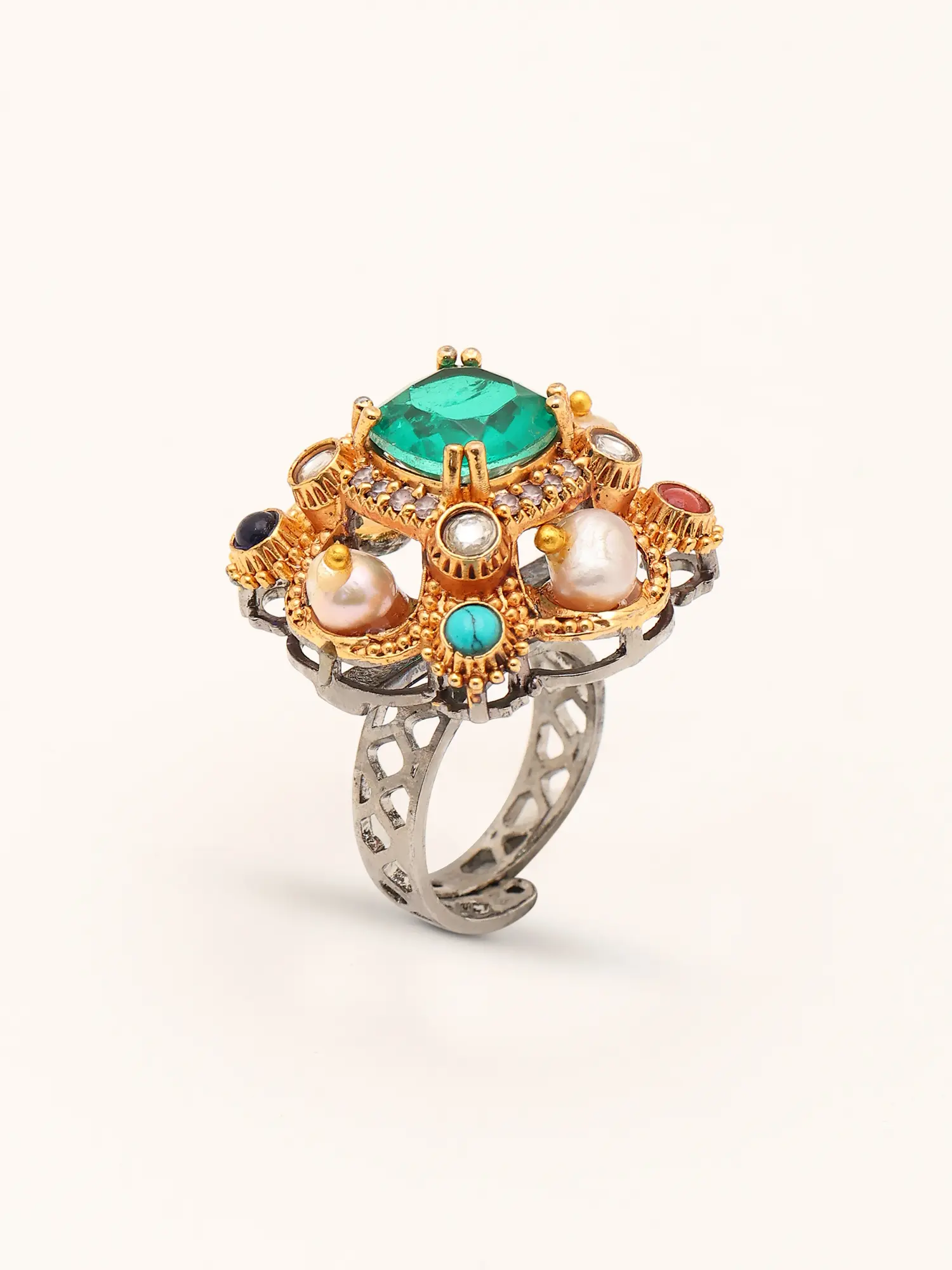 This exquisite ring is a symphony of color and texture, a testament to artistry and vibrant design. Crafted with meticulous detail, this piece is more than just an accessory; it's a statement. The design features a medley of different stones, each carefully chosen to create a harmonious blend of hues. The focal point of this piece is a generously sized, square-cut stone that commands attention with its rich, captivating green hue. This large stone is surrounded by smaller stones of various colors, adding depth and dimension to the overall design. Lustrous pearls are strategically placed within the setting, adding a touch of classic elegance and softening the bold color palette. The combination of pearls and colored stones creates a captivating contrast that is both eye-catching and sophisticated.