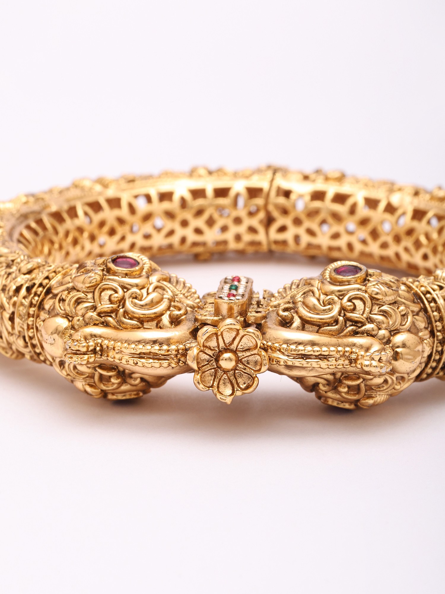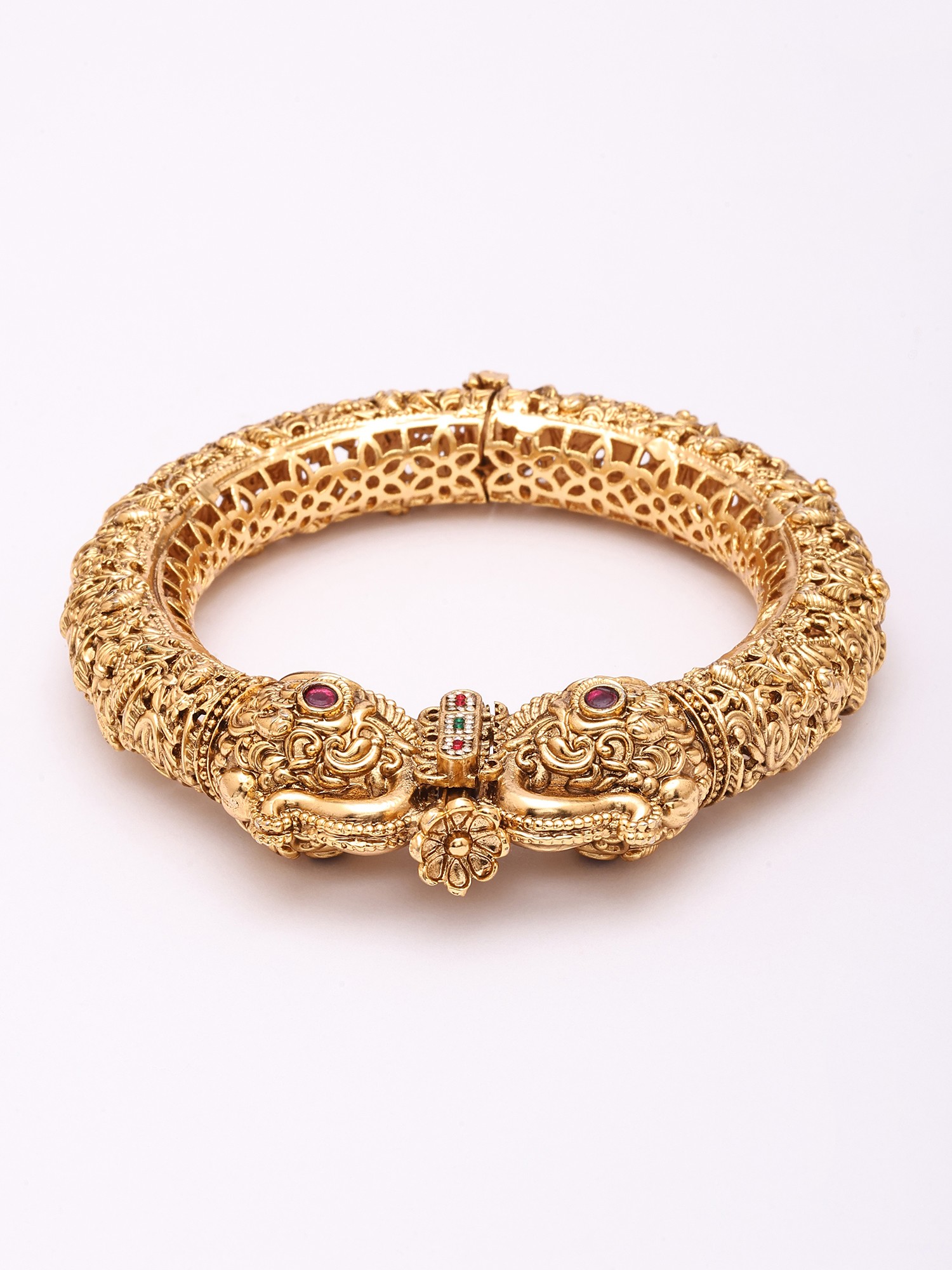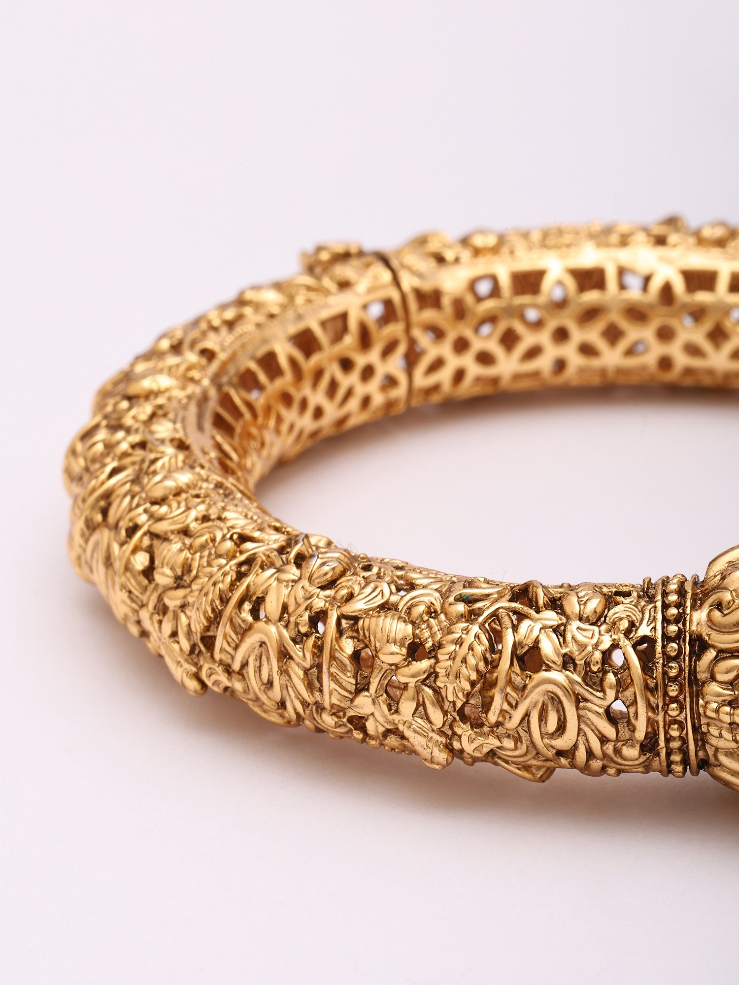 Intricate temple-style carvings adorn this openable kada bangle.