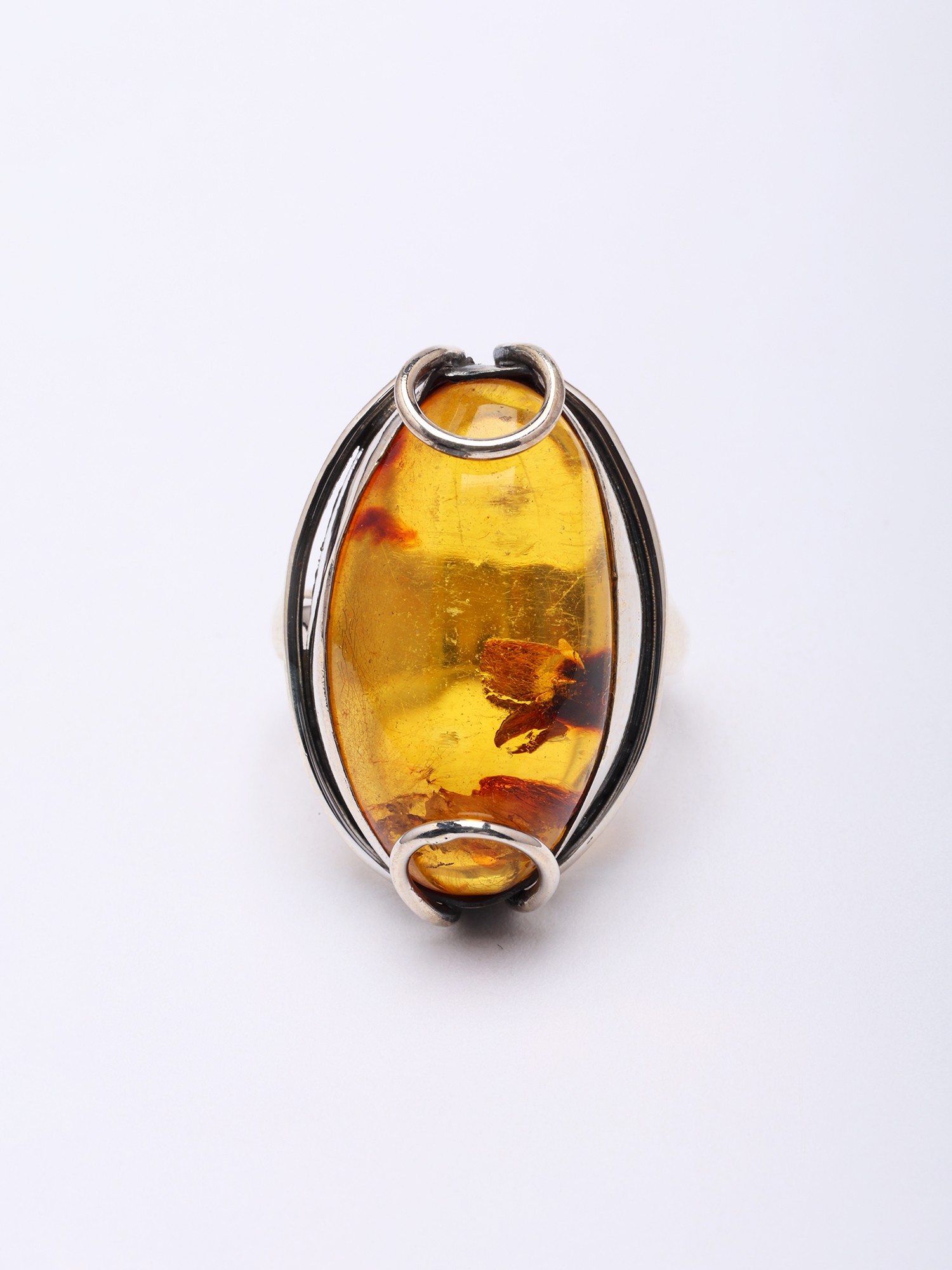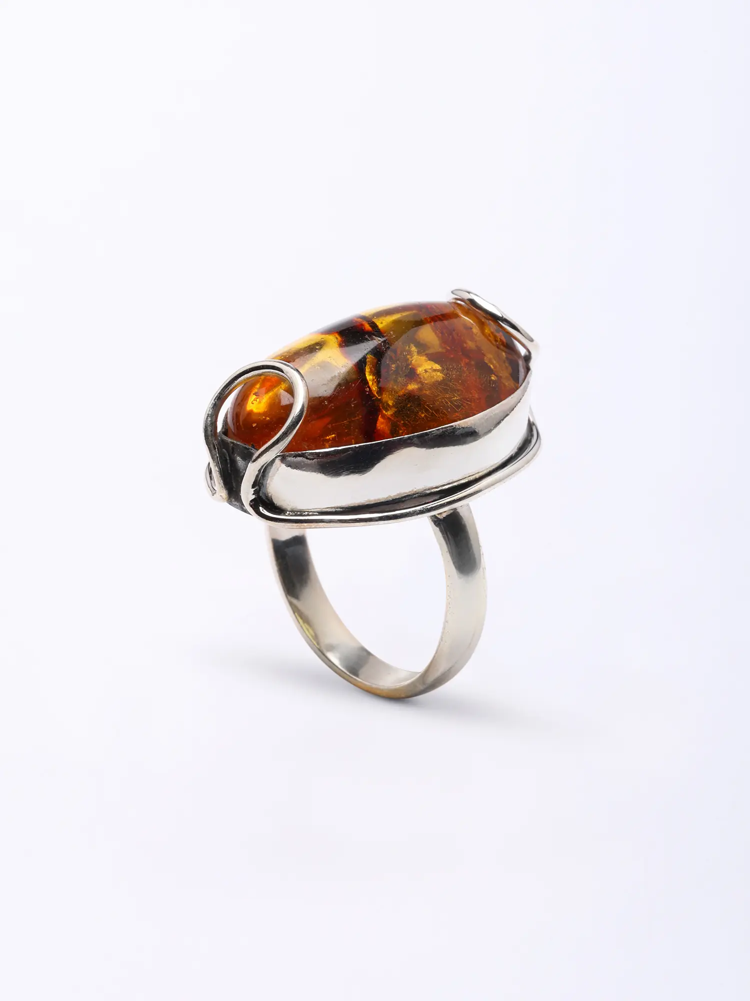 The amber gemstone is cradled in a meticulously crafted sterling silver setting. The design seamlessly blends classic elegance with a touch of modern flair. The smooth lines of the silver enhance the amber's natural allure, creating a harmonious and eye-catching piece of jewelry. The open design allows the amber to breathe and display its full luminosity, while also providing a comfortable fit on the finger. This ring is more than just an accessory; it's a wearable piece of art.
