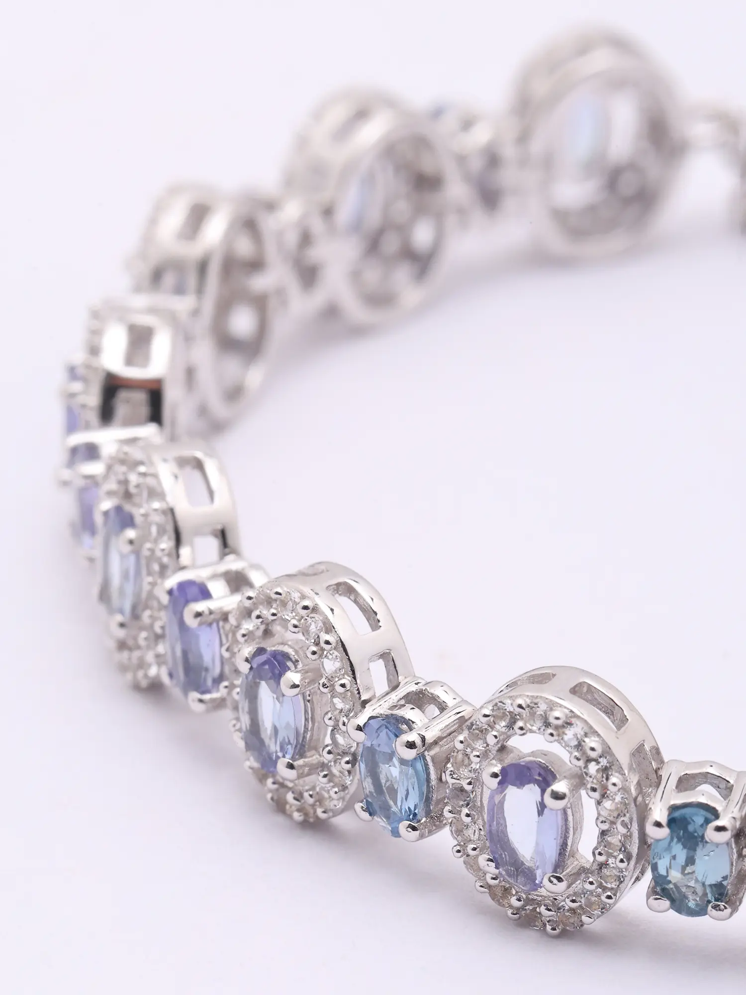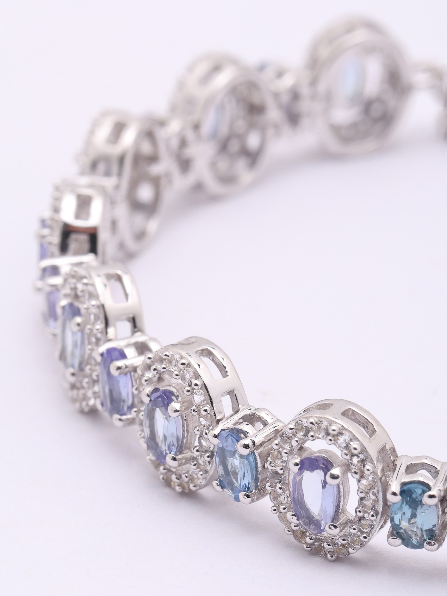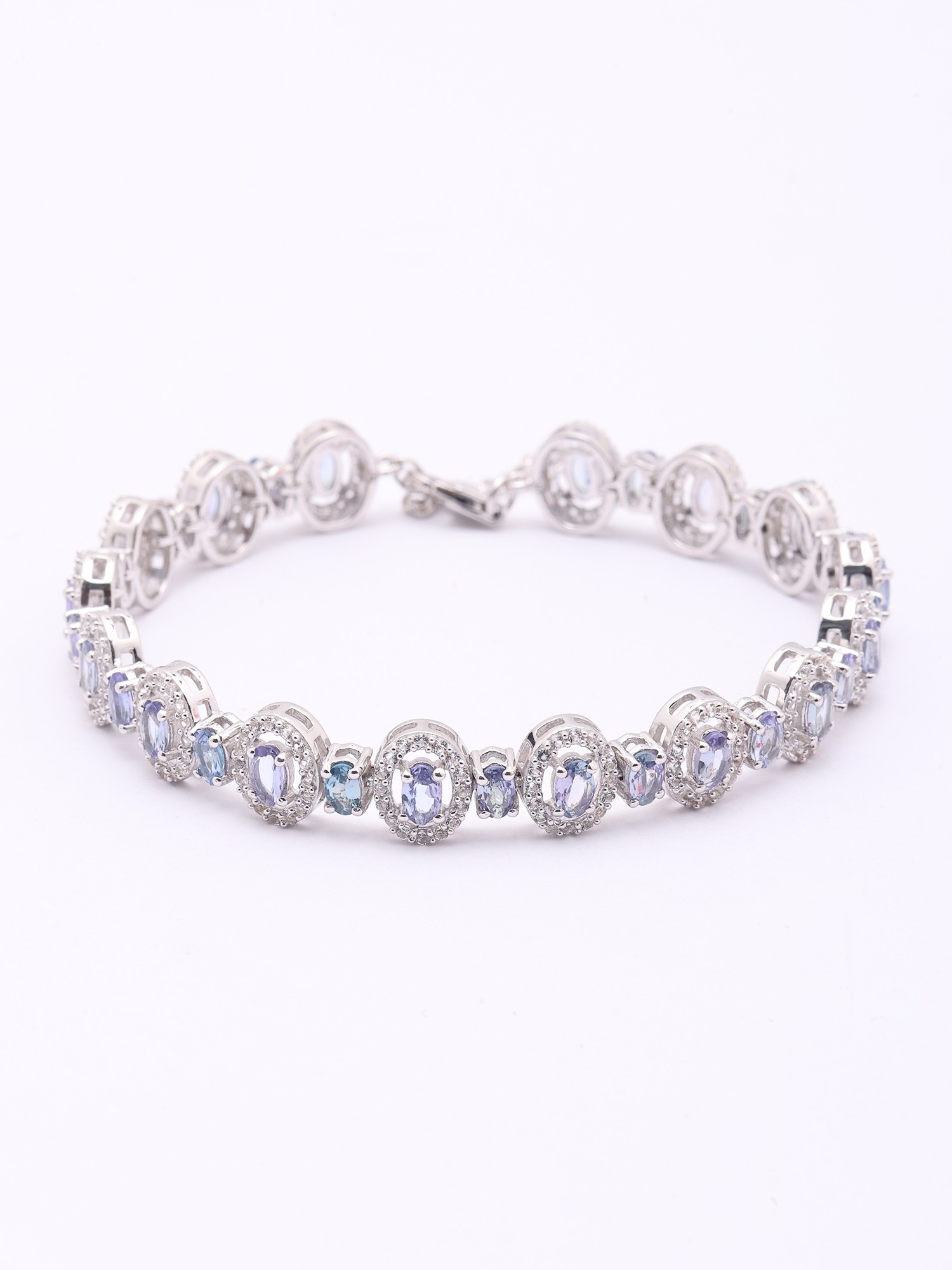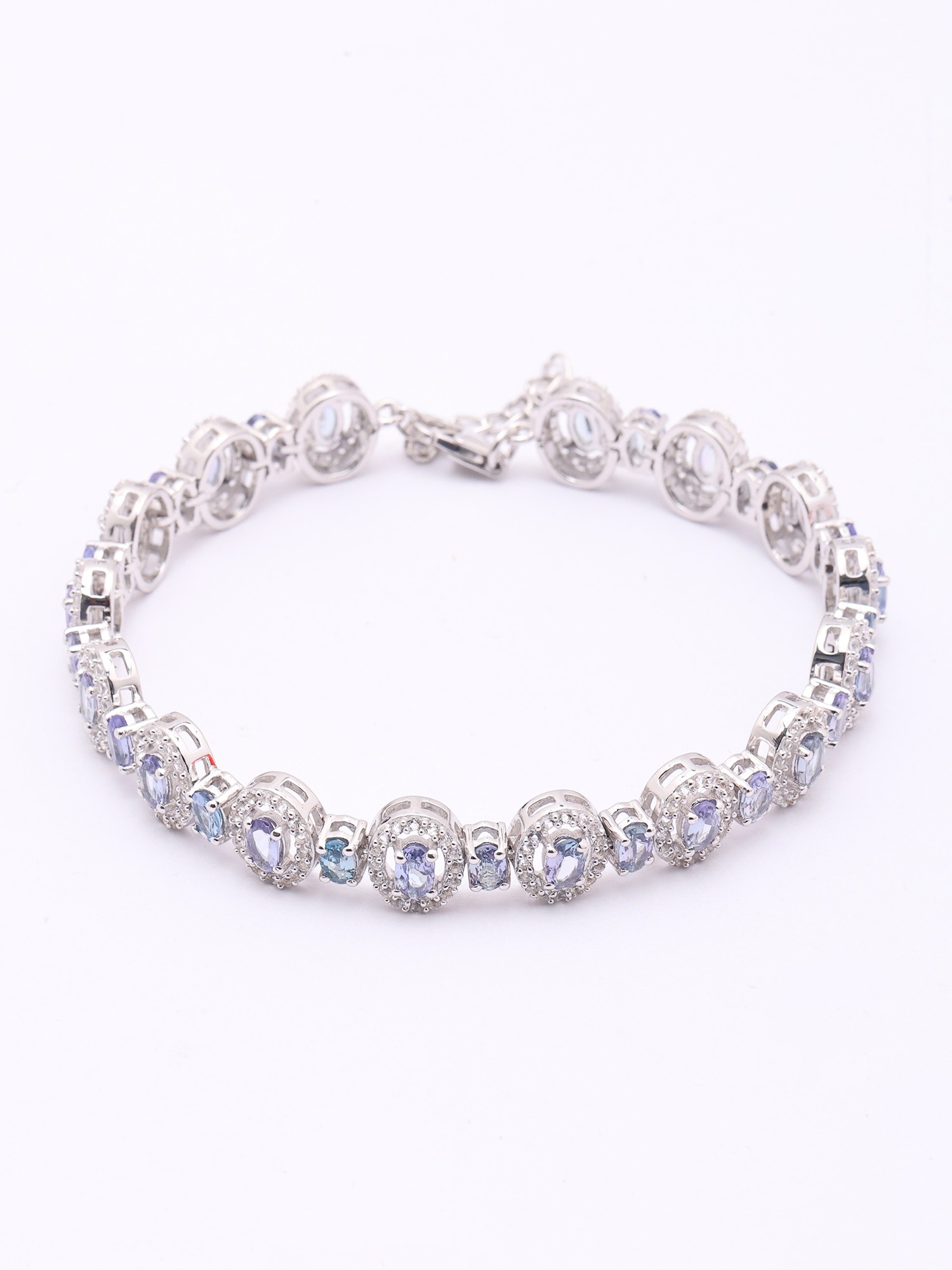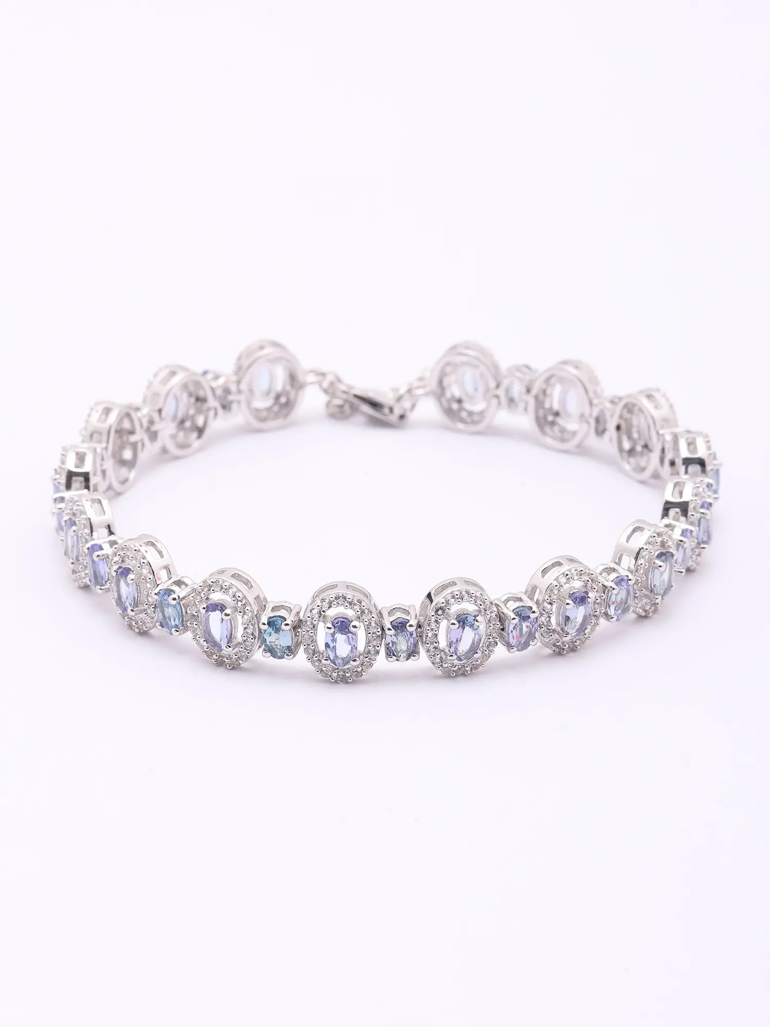 At the heart of this creation lie oval-cut faceted tanzanite stones, celebrated for their rich, alluring violet-blue hues. These captivating gems are encircled by delicate halos of smaller, brilliant stones, each one adding a further sparkle that dances with every movement. The seven-inch length ensures a comfortable and elegant drape on your wrist, highlighting the exquisite balance of the design.