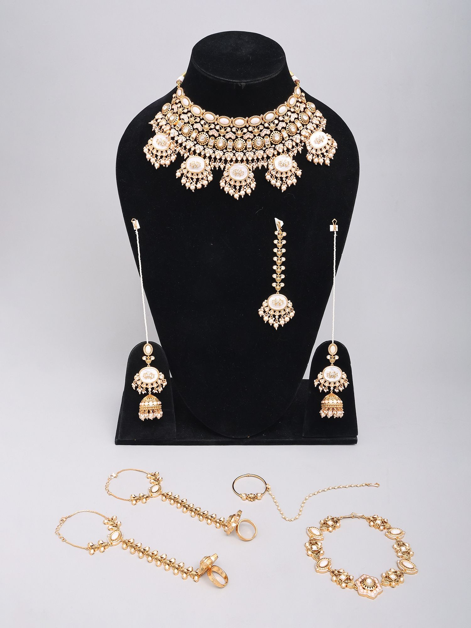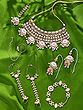 Features a complete bridal jewelry ensemble including a statement necklace, coordinating earrings, and traditional head/face adornments.