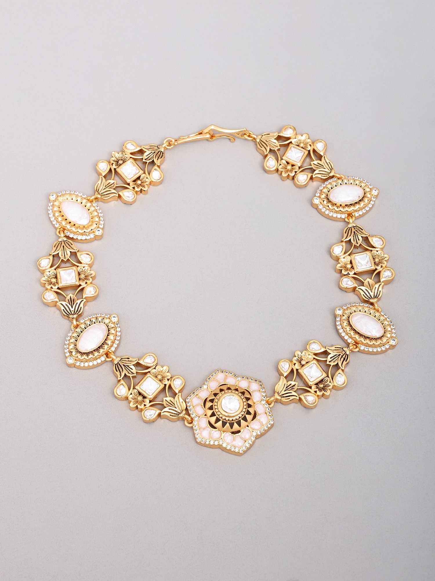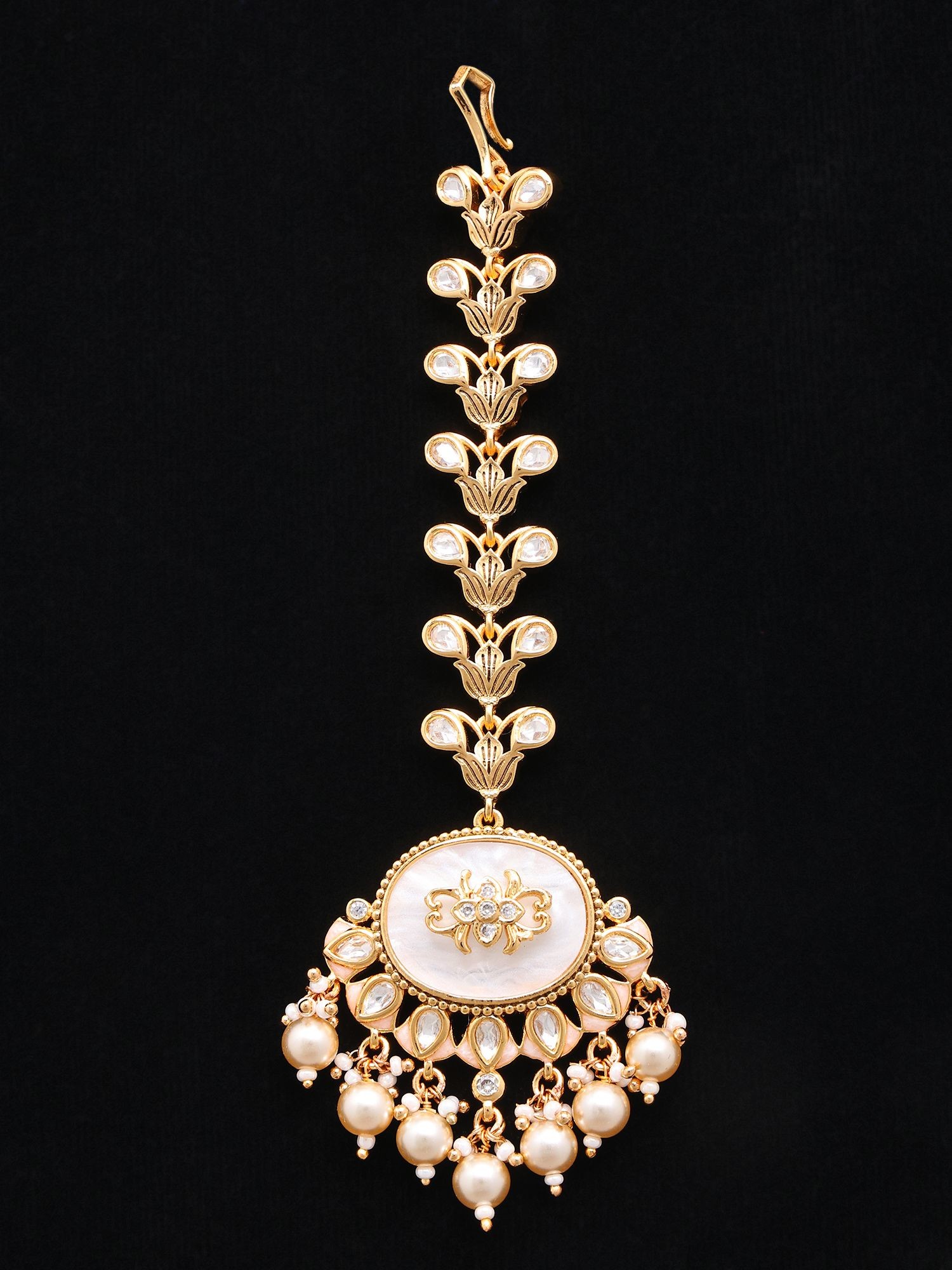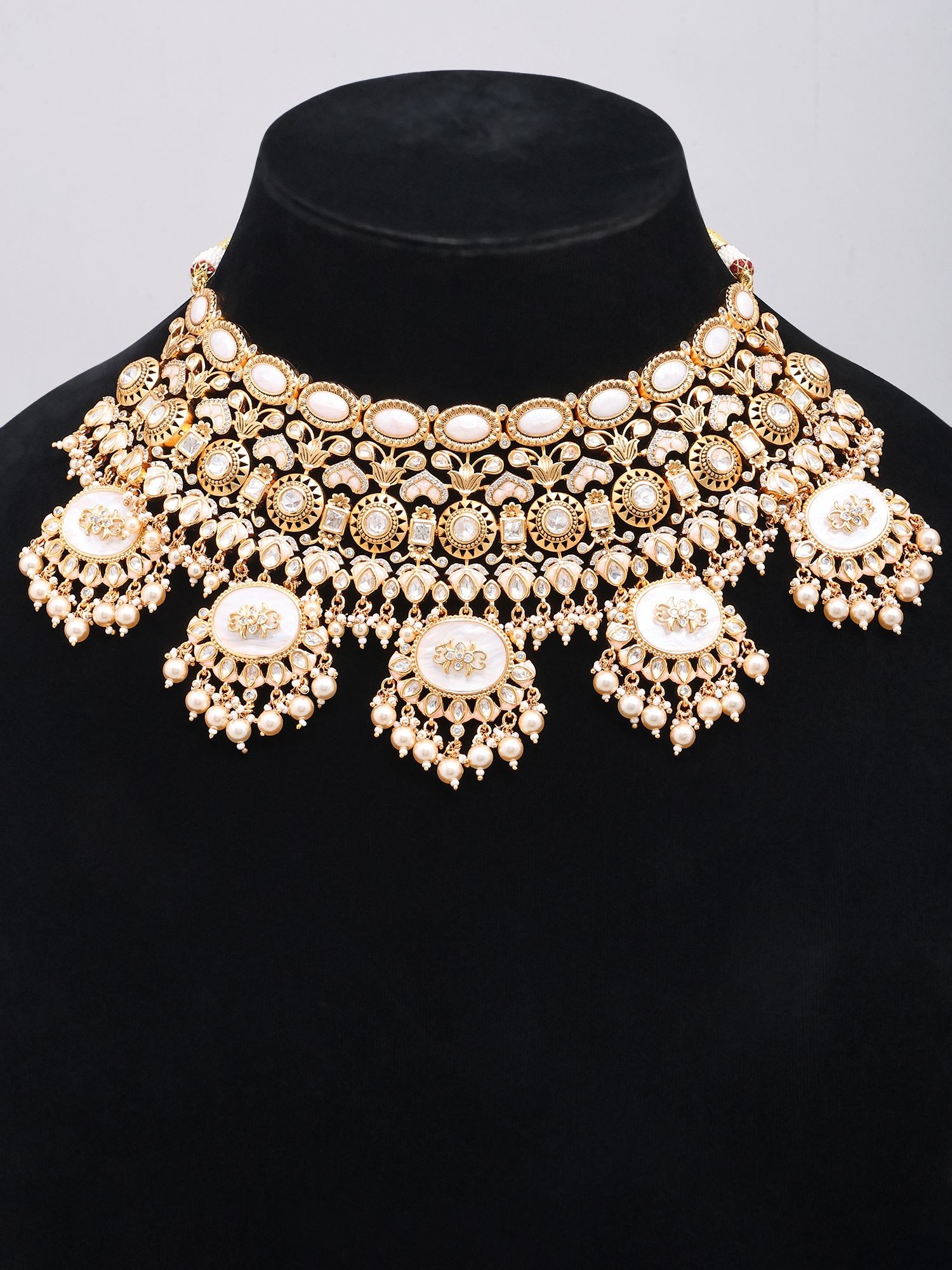 Adorned with intricate oval cut Kundan stones for a classic, elegant bridal look.