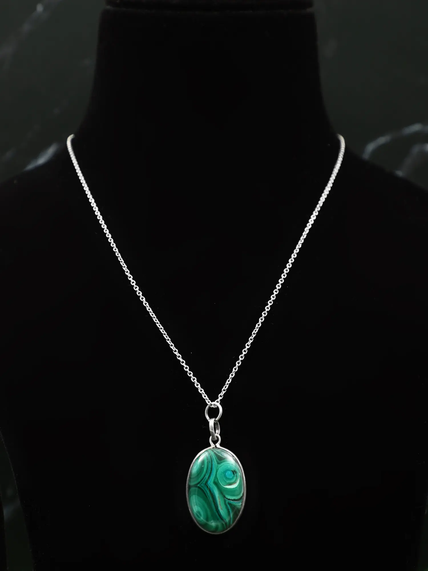 The versatility of this pendant allows for endless styling options. Dress it up with a formal gown for a sophisticated evening look, or dress it down with a simple blouse and jeans for a touch of everyday elegance. It complements a variety of outfits and personal styles, making it a truly versatile addition to your jewelry collection. The delicate sterling silver chain adds a touch of understated grace, further enhancing the beauty of the malachite pendant. Pair it with other silver jewelry for a cohesive look, or let it shine as a standalone statement piece. This pendant is a perfect gift for yourself or a loved one who appreciates elegant, meaningful jewelry.