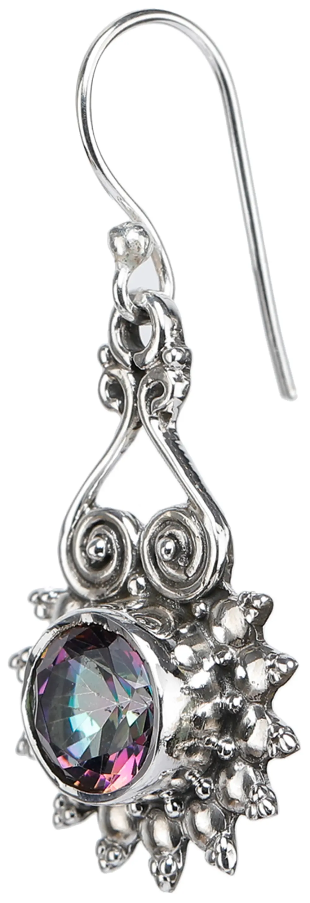 The allure of the Mystic Topaz is perfectly complemented by the rich, cool tones of sterling silver. The earrings are expertly crafted from genuine sterling silver, a timeless metal celebrated for its durability, hypoallergenic properties, and classic appeal. The intricate design features a delicate filigree setting that cradles the oval-cut topaz, enhancing its vibrant glow. The sterling silver forms a radiant sunburst motif around the gemstone, adorned with meticulously placed beads that add texture and depth. Swirling scrollwork at the top of the setting adds an element of vintage-inspired elegance, creating a truly statement-making piece.