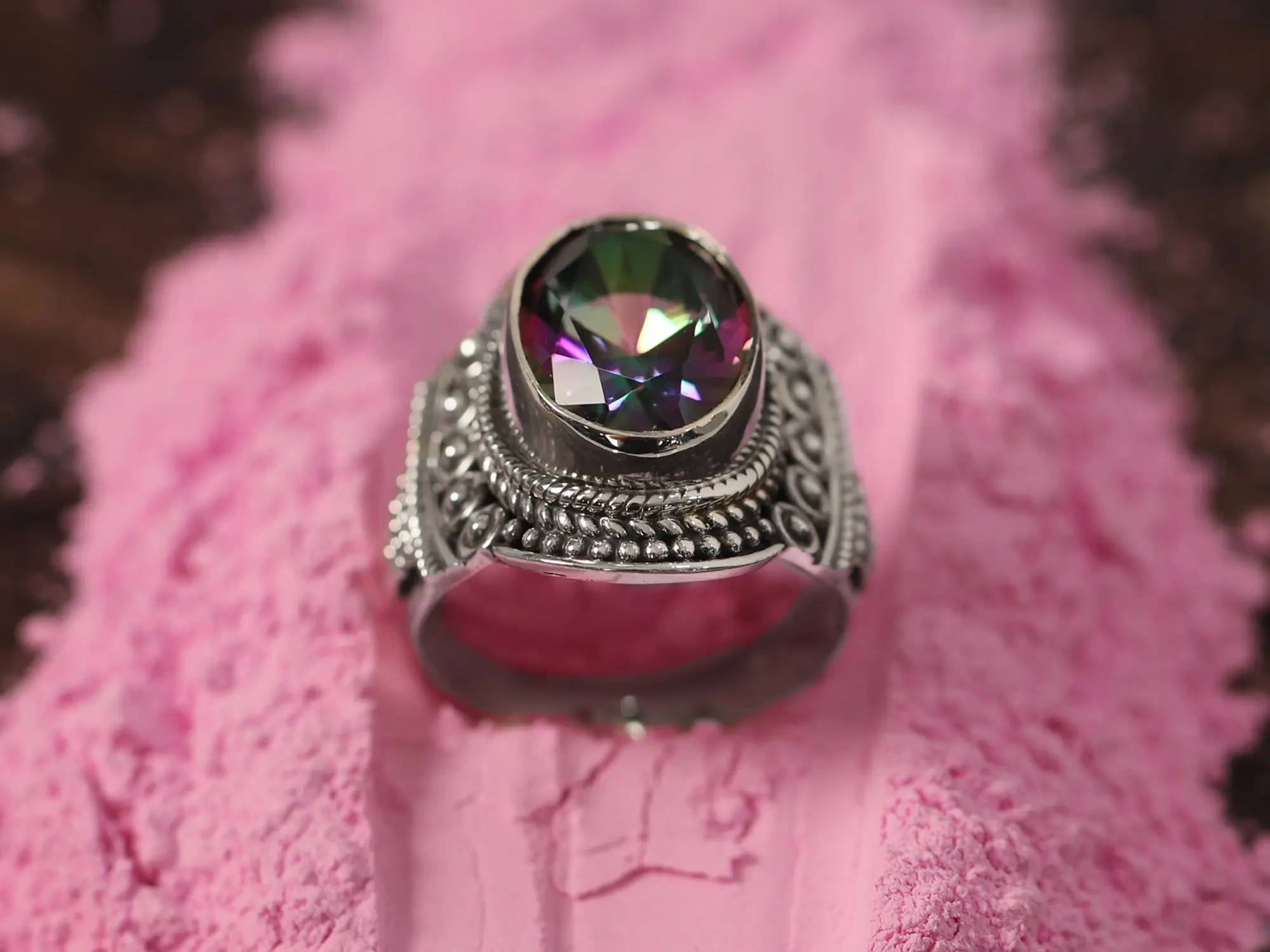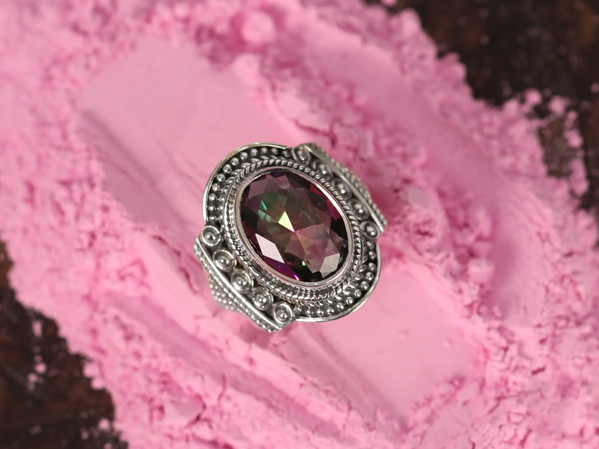 This sterling silver ring, crowned with an enchanting oval mystic topaz, is an embodiment of the marvels beneath the earth's surface, transformed into a piece of wearable poetry. The mystic topaz, known for its shifting colors and depth, is reminiscent of the aurora borealis captured within a crystal lattice. It’s believed that this gemstone possesses the power to soothe and calm, to dispel negativity and to usher in a sense of joy.