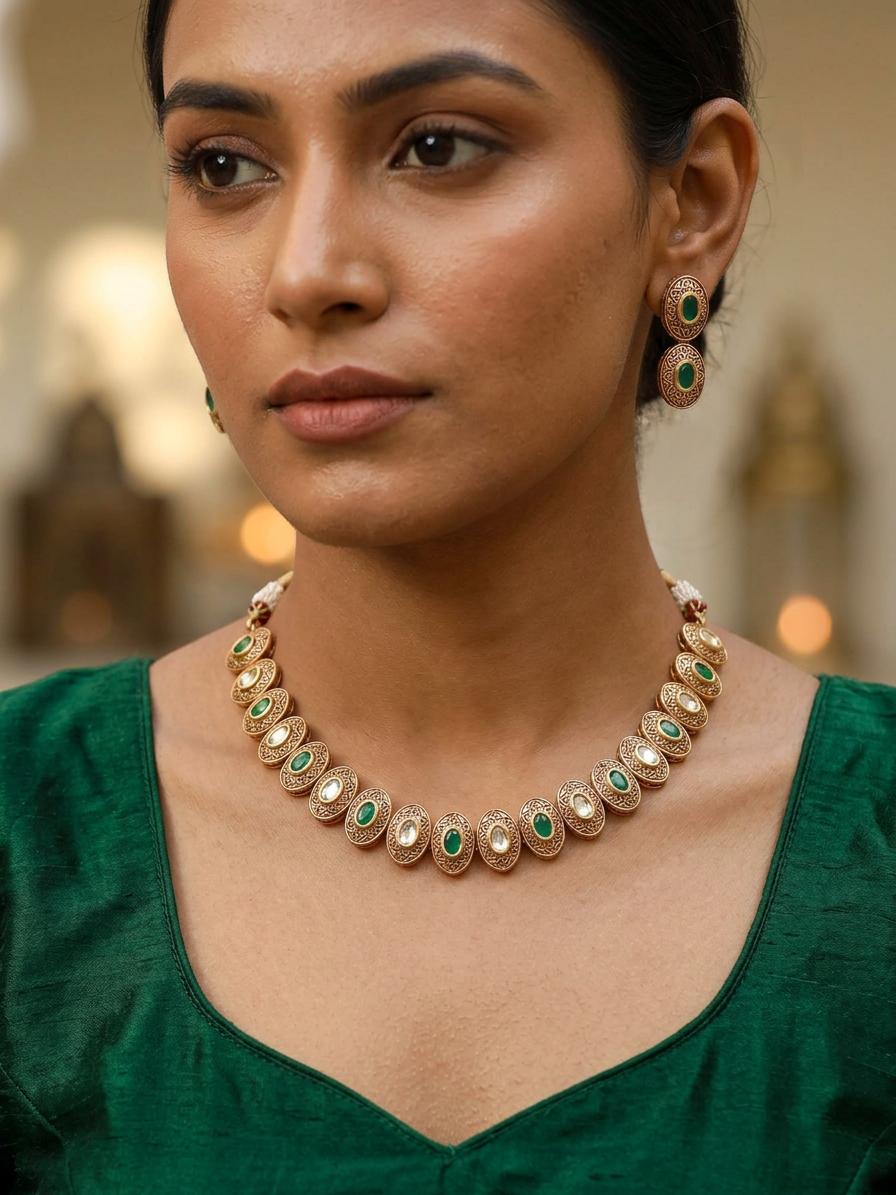 This necklace and earring set offers a versatile addition to your jewelry collection. Its classic design complements both traditional and contemporary outfits. Wear it with a silk sari for a traditional Indian look, or pair it with a simple dress for a touch of elegance. Its design is ideal for women and girls of all ages. This set will become a cherished piece that you'll reach for time and time again.