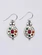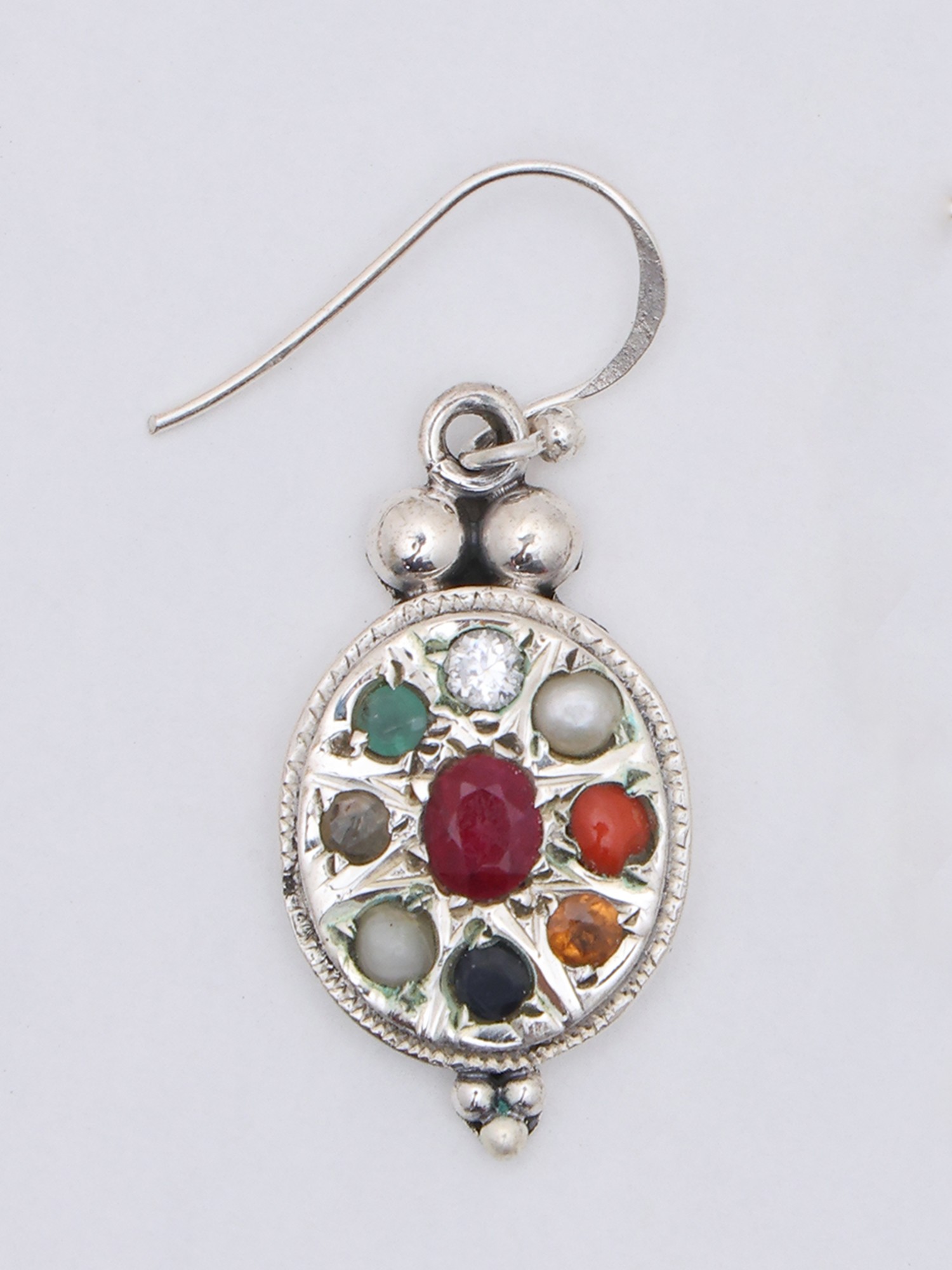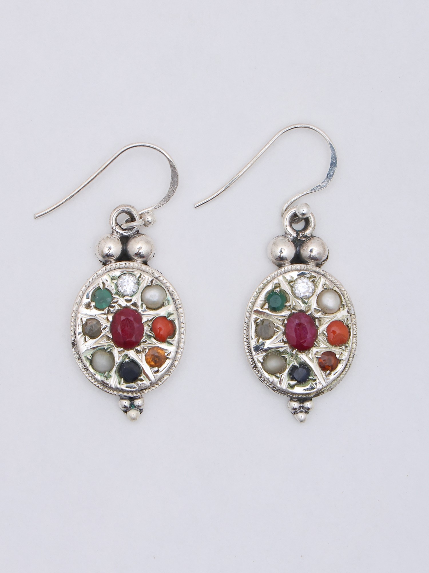 Experience the allure of ancient symbolism with these captivating earrings. Crafted with meticulous detail, these pieces showcase a harmonious blend of sterling silver and the vibrant energy of Navaratna gemstones. They're more than just accessories; they are wearable art, steeped in tradition and believed to bring balance and prosperity to the wearer. Each earring features a unique design, where nine precious gemstones are thoughtfully arranged, mirroring their celestial counterparts in Vedic astrology. The centerpiece, a rich, deep red ruby, radiates warmth and vitality, drawing the eye to the intricate beauty surrounding it. Each gemstone is carefully set within the sterling silver frame, creating a dazzling display of color and light. The sterling silver base gives the entire piece a gleaming, polished look. The fine detailing work around the stones and on the setting adds a subtle texture and makes these earrings a striking combination of contemporary style and timeless appeal.