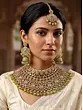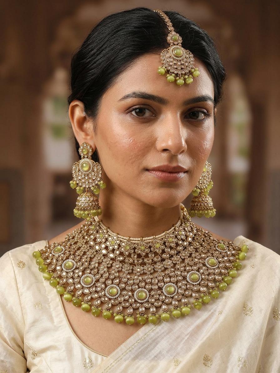 The set is completed with a pair of matching earrings and a maang tikka. The earrings echo the choker's design, featuring the same stunning olive-green stones and delicate detailing. Their size is perfect to complement the necklace without overpowering it. The maang tikka, a traditional forehead ornament, adds the perfect finishing touch, completing the regal look. Its design seamlessly blends with the earrings and necklace, enhancing the overall magnificence of the set.