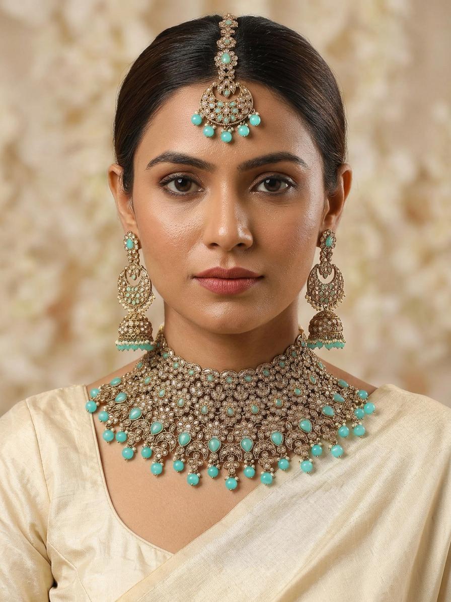 Make a statement with this breathtaking choker necklace set, designed to captivate and enchant. This exquisite piece features a mesmerizing blend of sparkling stones and delicate detailing, perfect for adding a touch of regal charm to your special occasions. The vibrant, eye-catching turquoise stones are expertly set against a rich gold-toned base, creating a dazzling contrast that will surely turn heads. This set is more than just jewelry; it's a testament to timeless sophistication and unparalleled artistry.