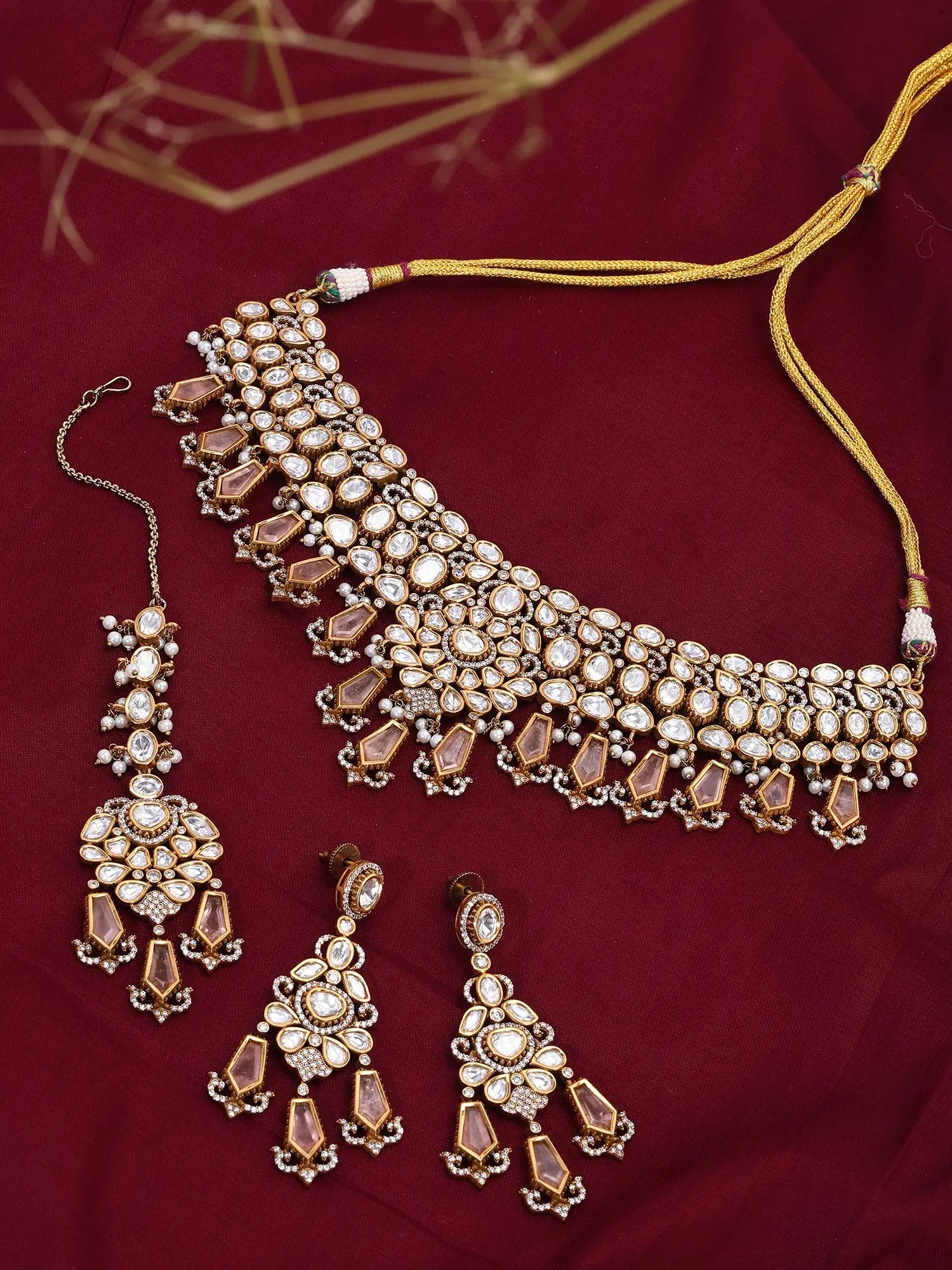 Peach Drop Stone Studded Kundan Bridal Choker Necklace Set with Maang Tikka
