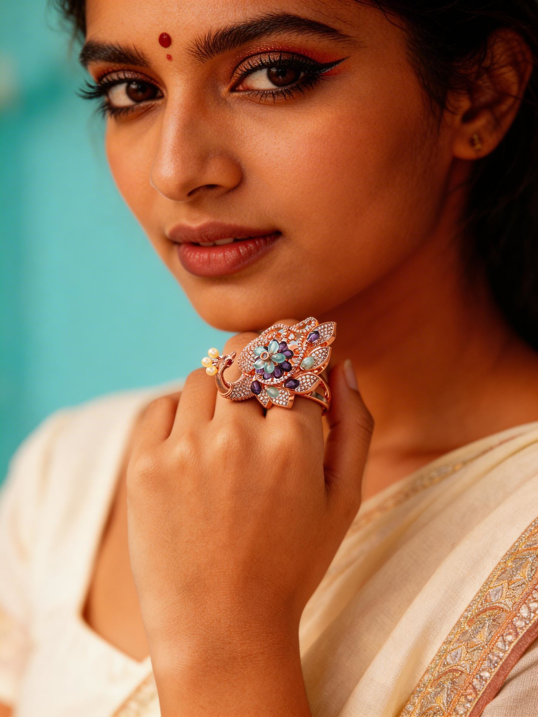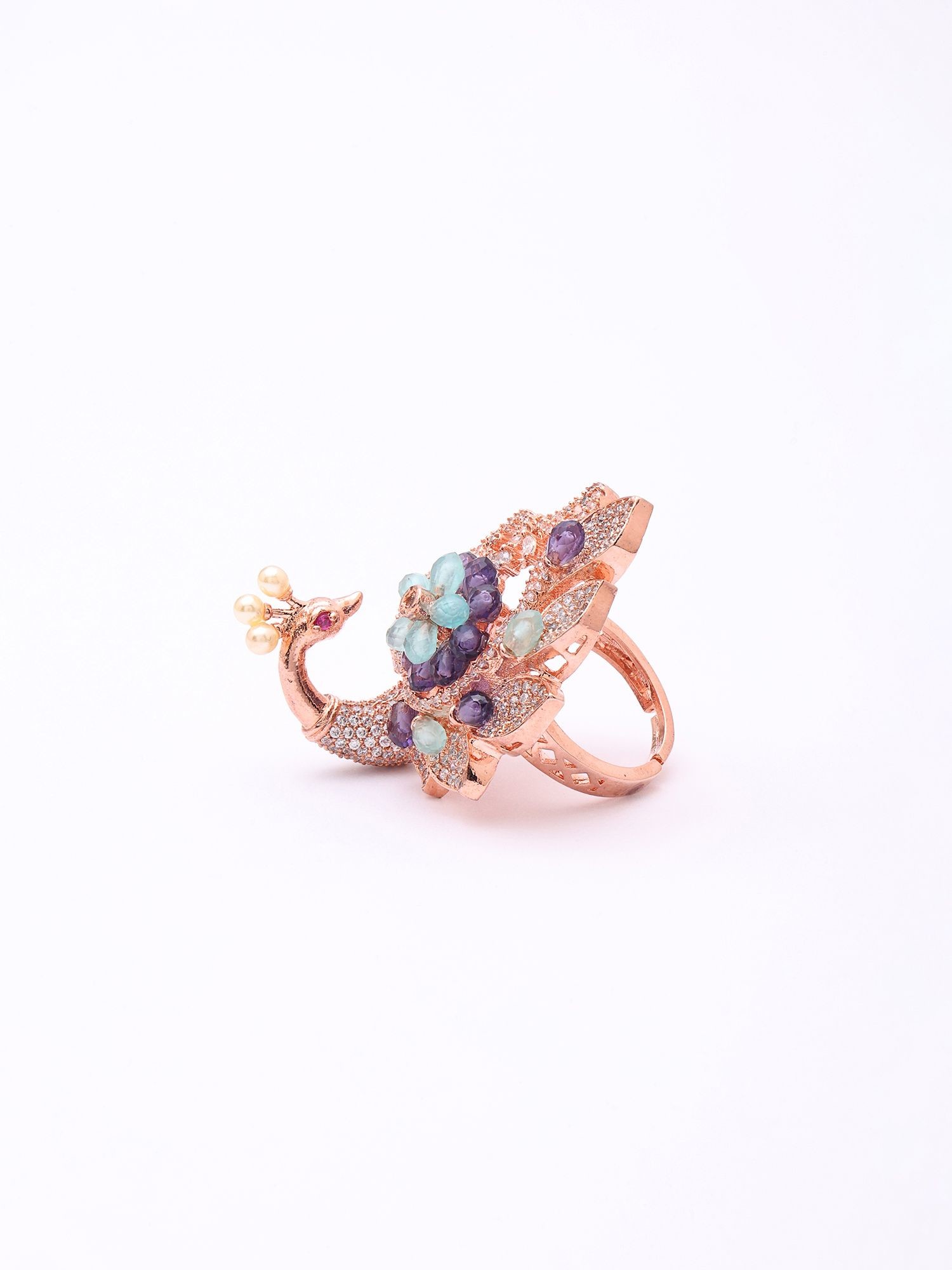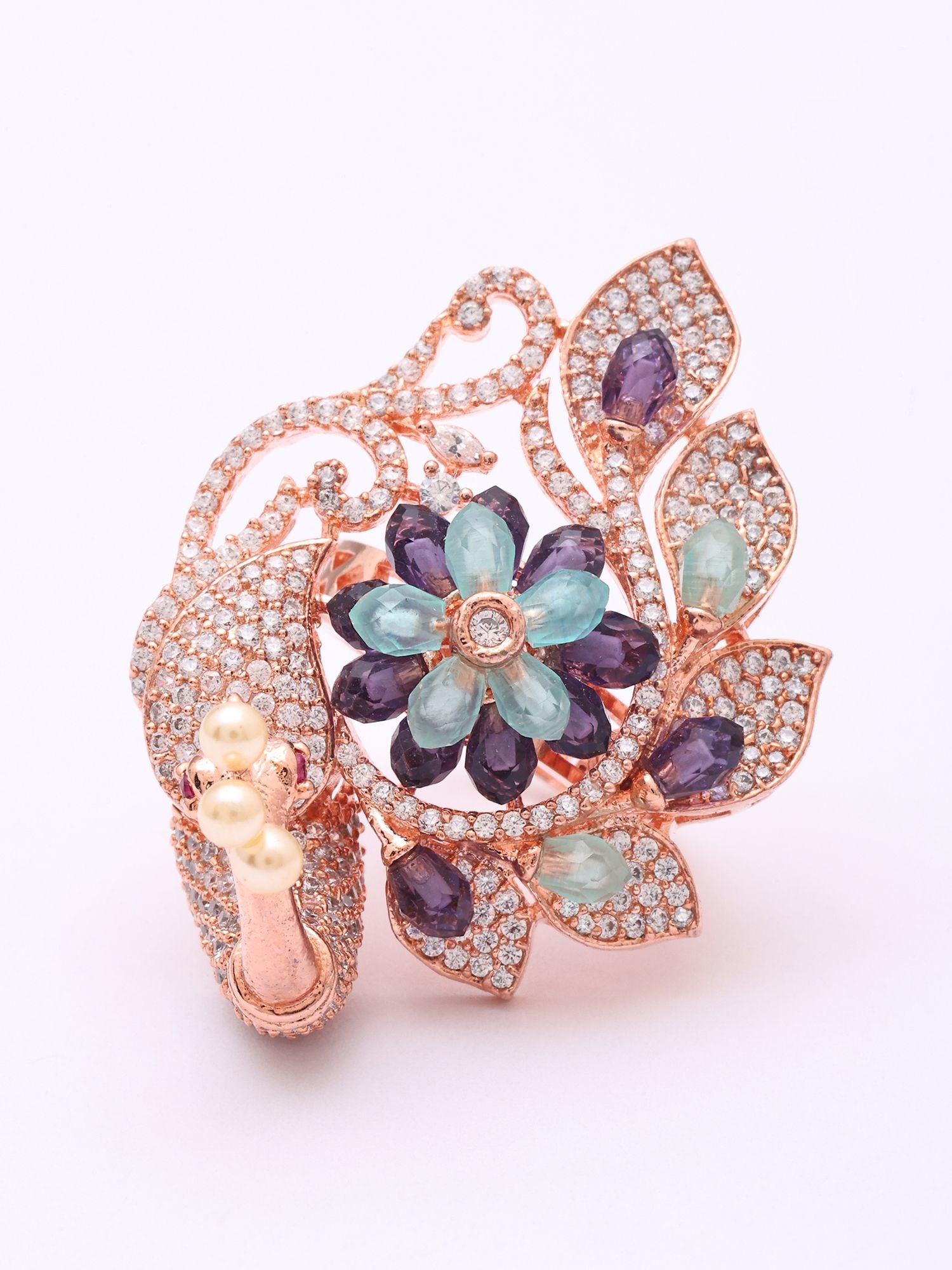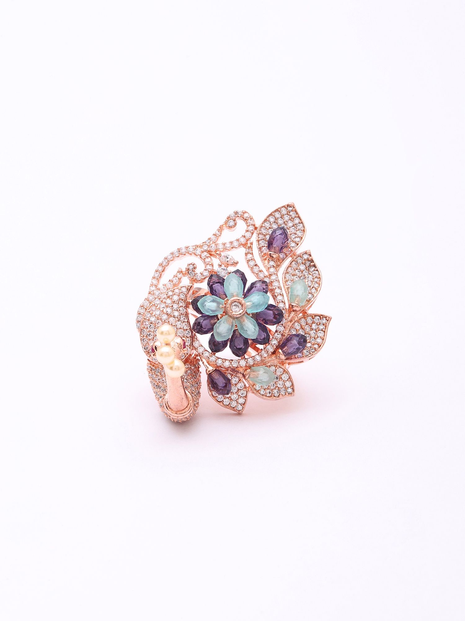 Peacock Design American-Diamond with Blooming Floral Center Adjustable Ring