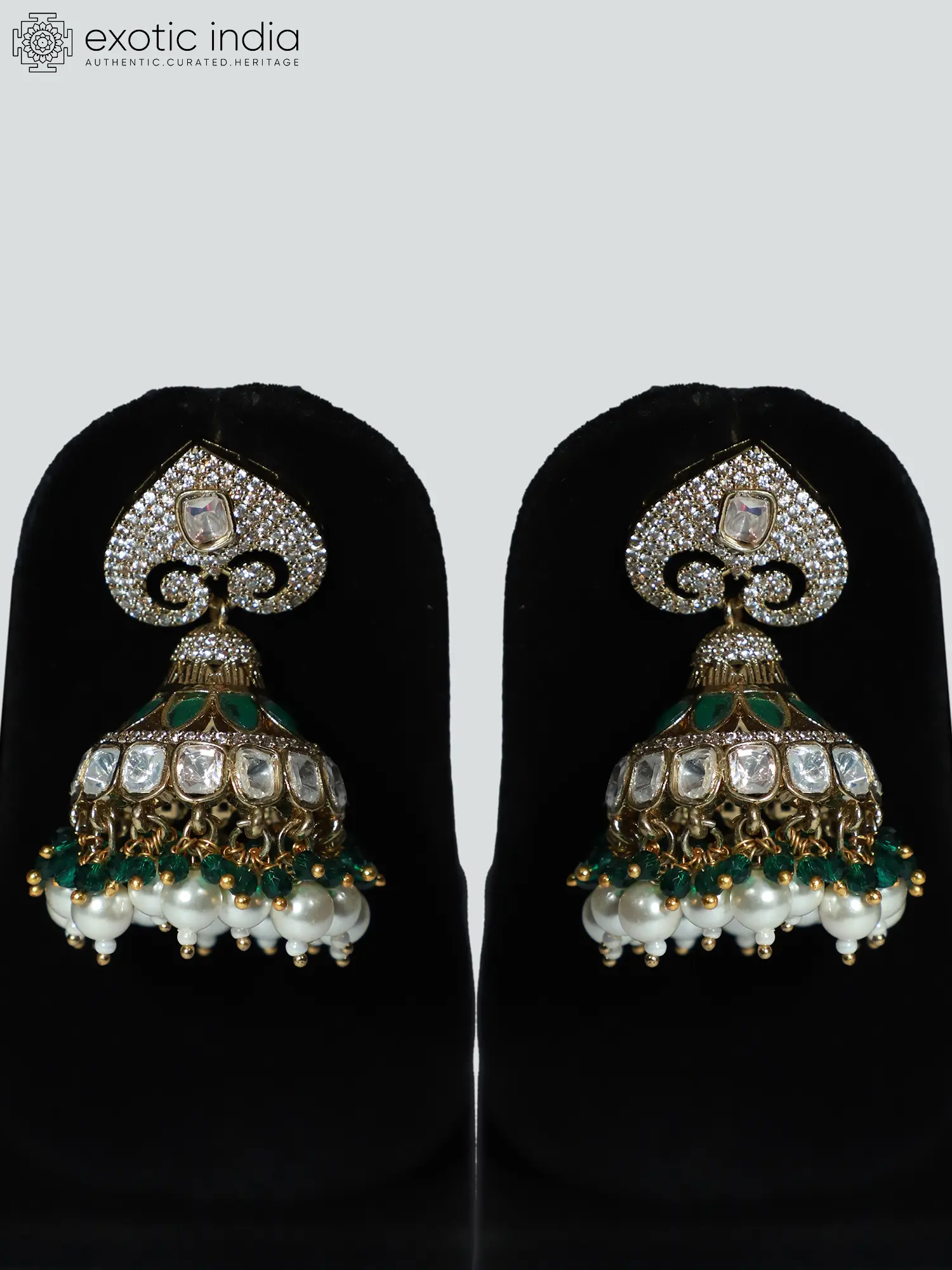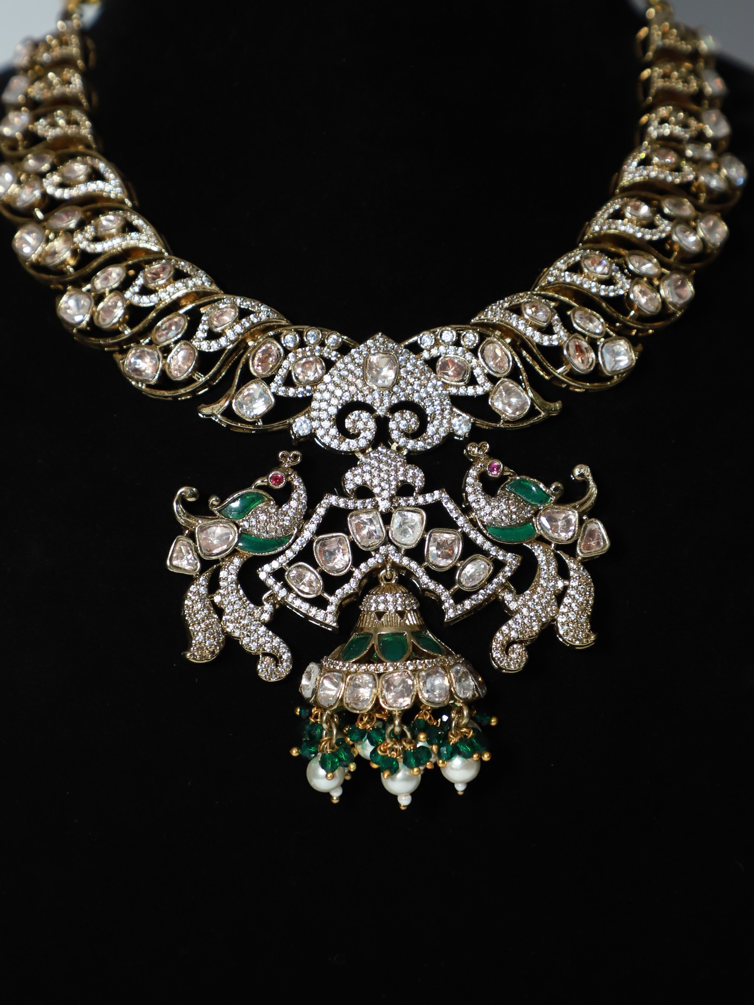 The centerpiece of this necklace set is undoubtedly the pair of peacocks, their emerald green accents contrasting beautifully against the shimmering white stones. These majestic birds, symbolic of beauty and grace, are meticulously crafted, showcasing the exceptional skill of our artisans. Each scale, each feather is painstakingly detailed, creating a breathtaking display of artistry. The design is not just visually striking but also carries a powerful cultural symbolism, making this necklace more than just an accessory – it's a piece of wearable art. The pendant's jhumka style adds a touch of traditional charm, the gentle sway of the pearls and beads creating an enchanting rhythm.