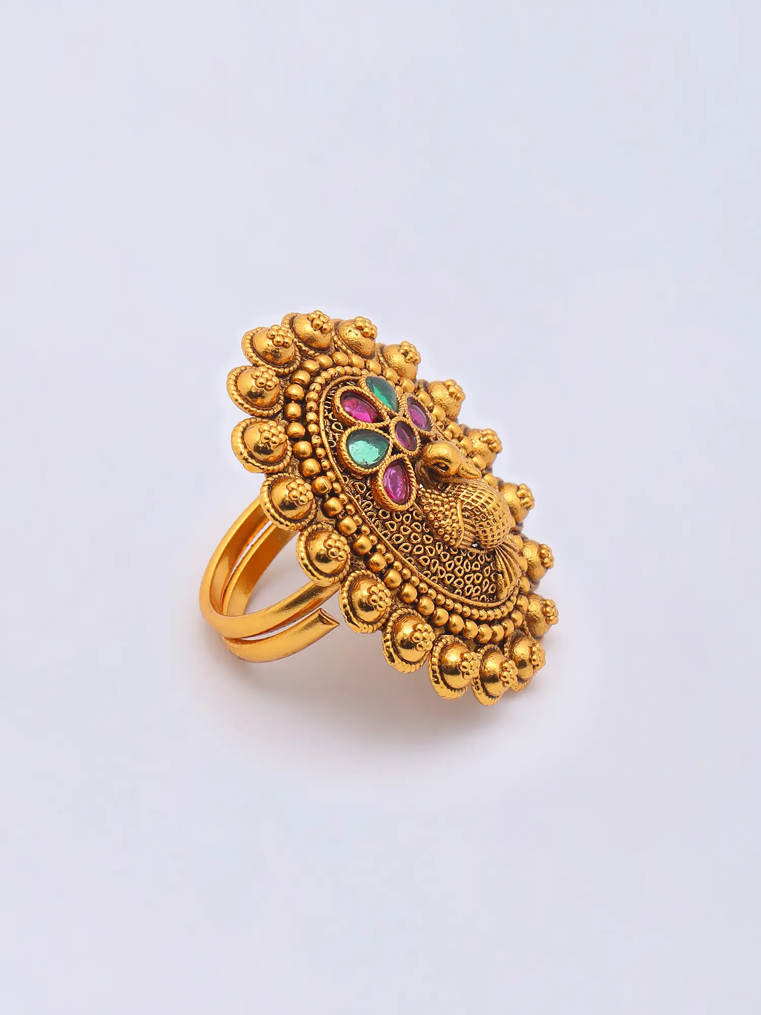 The design seamlessly blends traditional craftsmanship with modern aesthetics. The antique gold finish and the intricate peacock motif lend a timeless quality, while the overall design and use of green stones make it remarkably contemporary. This versatile ring effortlessly complements a variety of outfits and styles. Whether you pair it with a traditional saree, a modern dress, or even casual attire, it will add a touch of sophistication and elegance.
