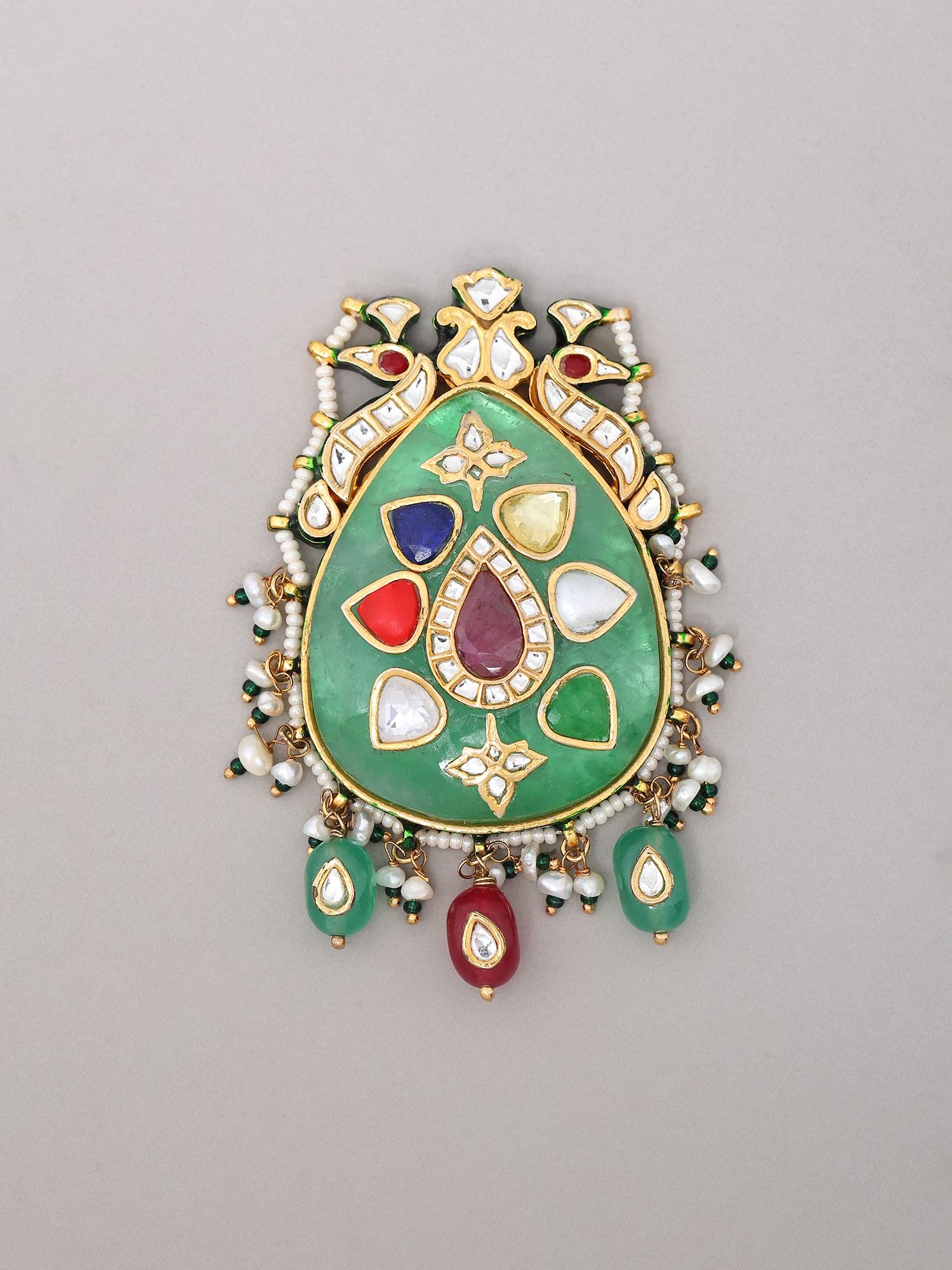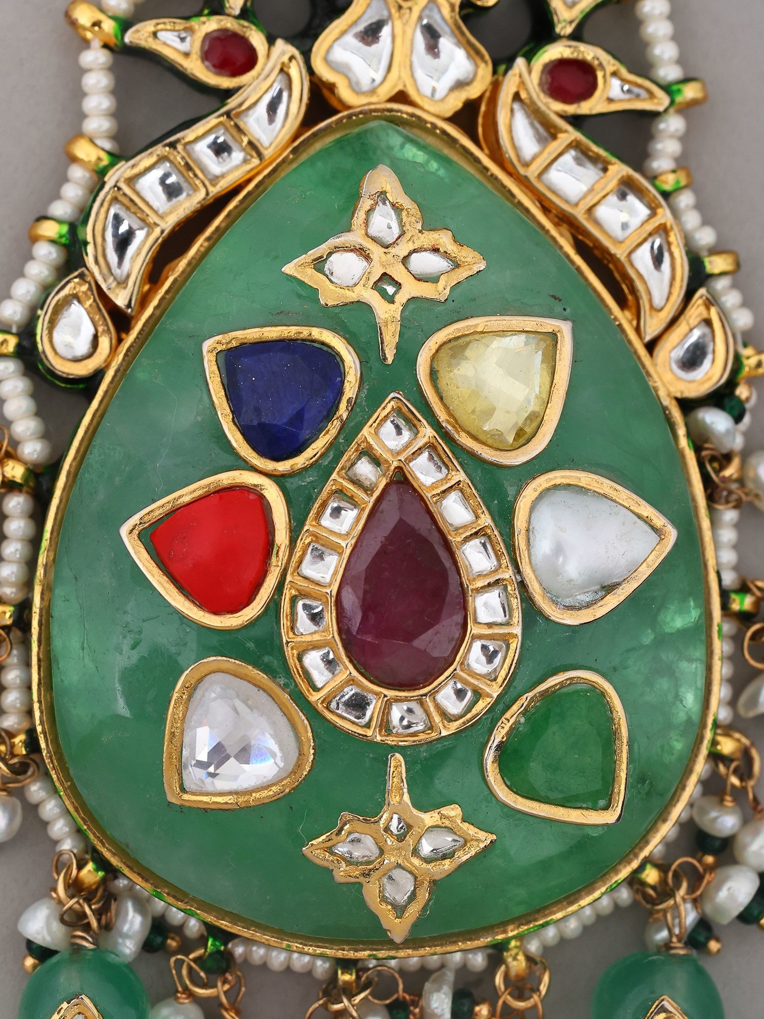 Adorned with a vibrant array of navratna-inspired gemstones, including ruby and emerald hues.