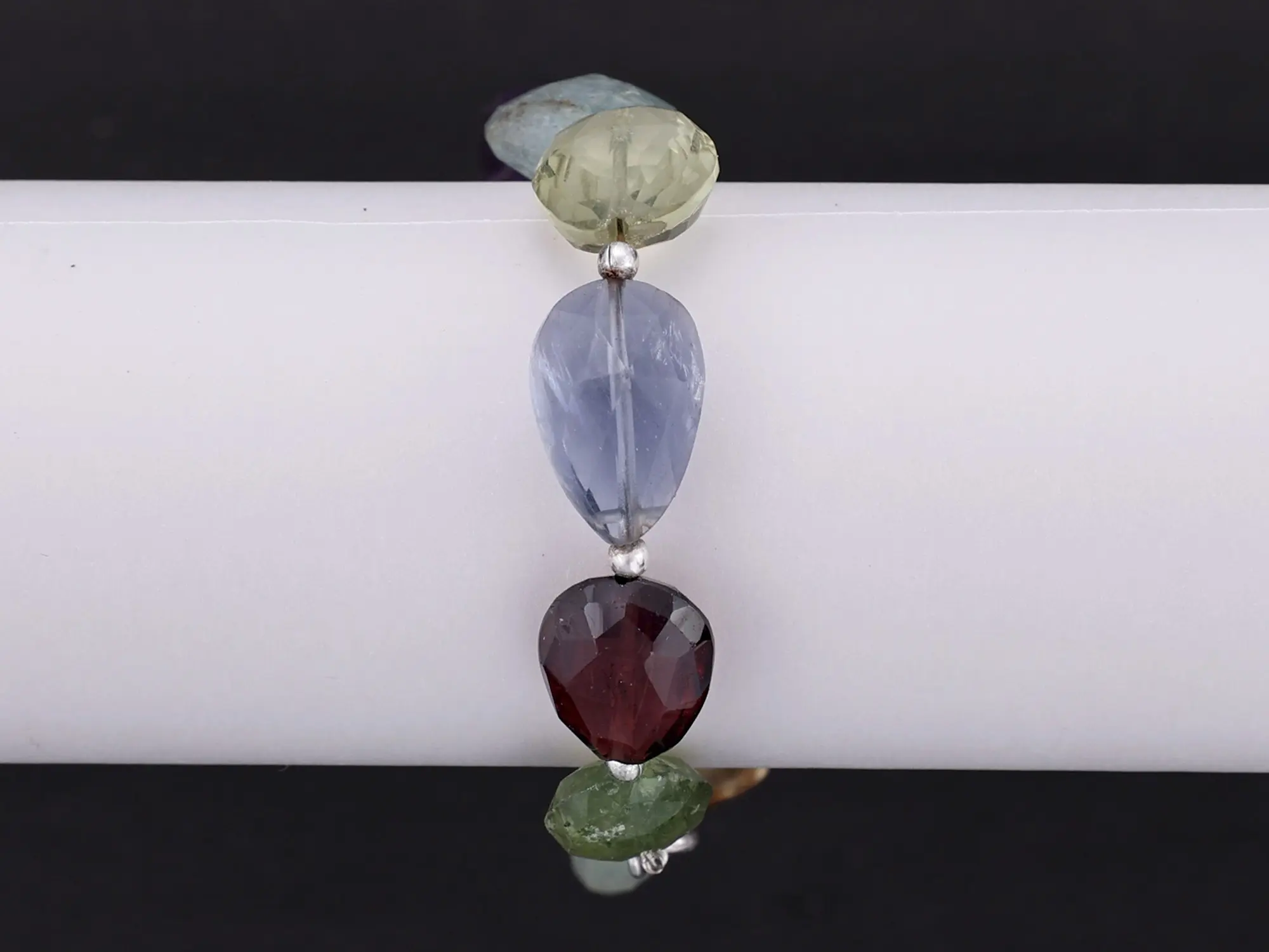 Indulge in sophistication with this pear-shaped multiple gemstone bracelet. Crafted with meticulous attention to detail, each pear-shaped gemstone showcases its unique color and allure, adding a touch of elegance to the piece. The arrangement of multiple gemstones creates a harmonious and vibrant look, perfect for enhancing any ensemble.