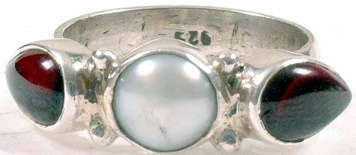 This handcrafted ring is more than just an accessory; it's a wearable work of art. The design features a captivating combination of a luminous pearl and two rich, red garnets, each carefully selected and set to create a visually stunning piece. The contrast of the smooth, iridescent pearl against the deep, fiery garnets creates a delightful visual harmony. The sterling silver setting provides a classic, timeless backdrop that allows the gemstones to truly shine.