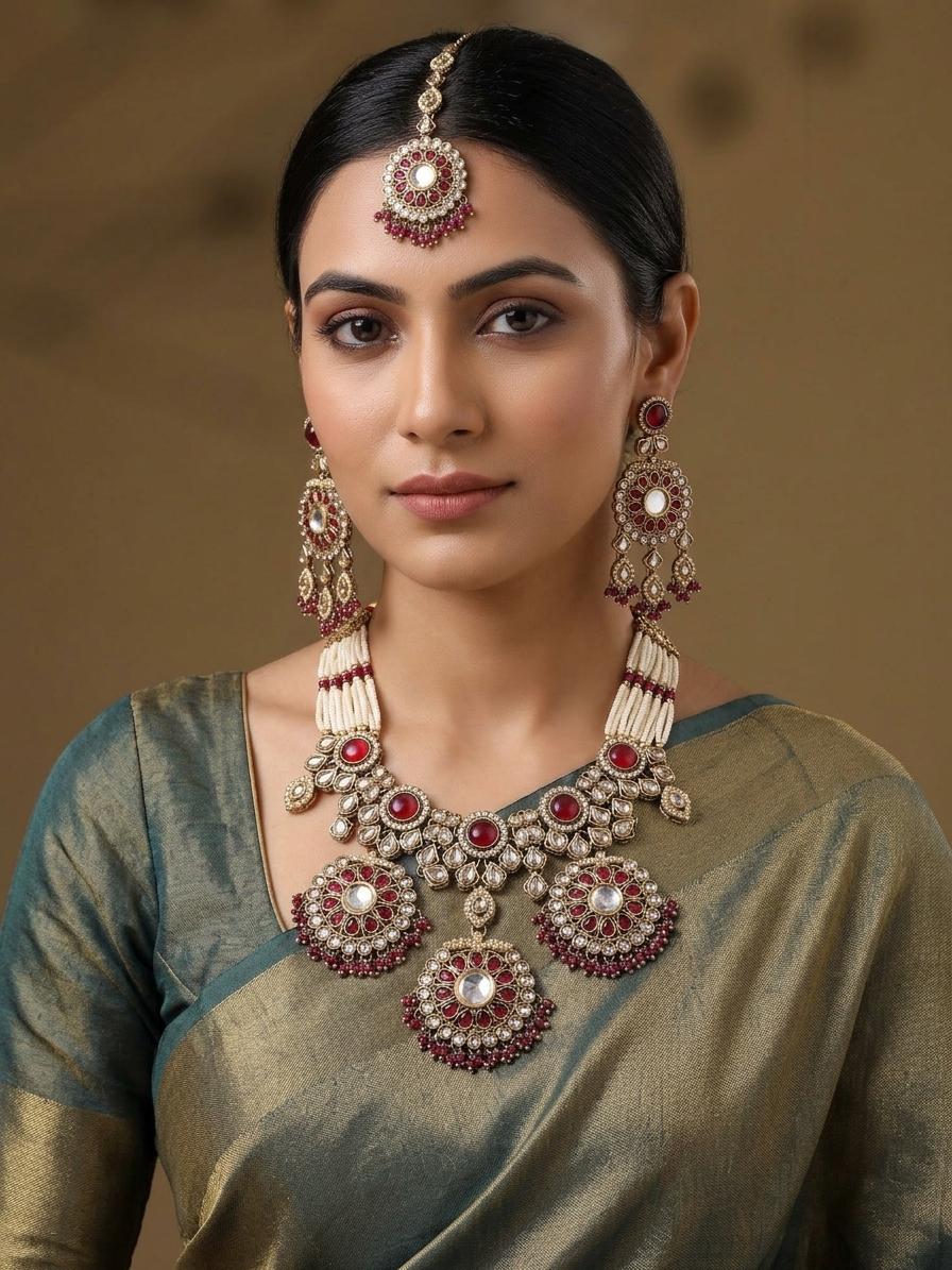 Elevate your ethnic wear with this stunning, meticulously crafted necklace set. Designed to capture the essence of traditional Indian elegance, this ensemble features a breathtaking necklace adorned with vibrant red stones and luminous pearls, complemented by matching statement earrings and a delicate mangtika. The rich, deep hue of the red stones exudes a sense of regal charm and sophistication, making it a perfect choice for weddings, festivals, and grand celebrations. Each stone is expertly set within an intricate golden framework, showcasing a fusion of classic design and contemporary artistry.