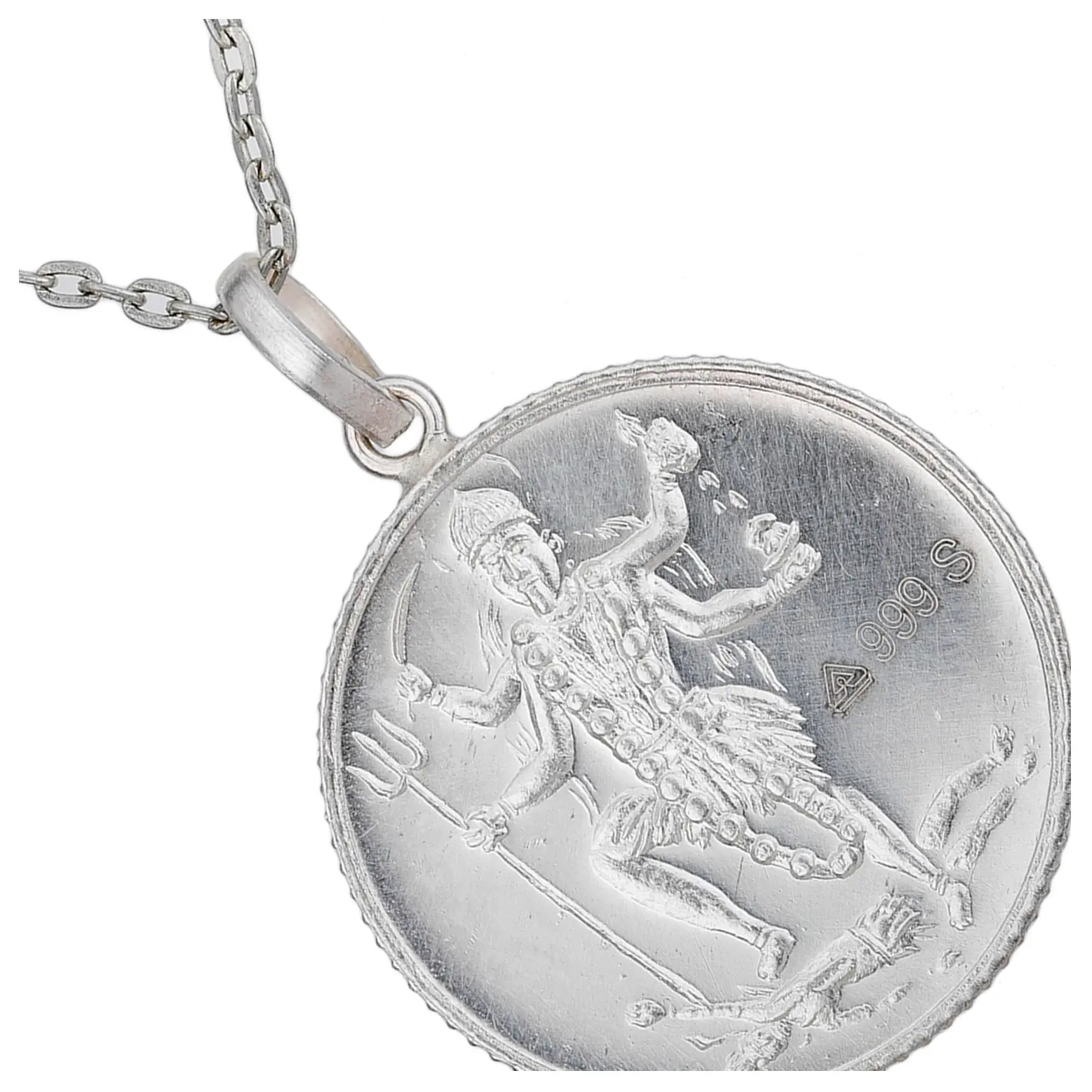 This pendant is not merely a piece of jewelry; it is a wearable piece of sacred art, crafted from high-quality sterling silver for lasting beauty and durability. The substantial silver content, marked with '999 S' to indicate its purity, ensures a piece that is both precious and enduring. Its circular design, with a diameter of 1.5 inches, makes it a prominent yet comfortable addition to any necklace. The bail at the top is designed for easy attachment to your favorite chain, allowing you to carry the protective presence of Goddess Kali with you wherever you go. Whether worn as an expression of faith, a talisman for strength, or a statement of personal style, this Kali pendant is a profound and beautiful embodiment of divine feminine energy.