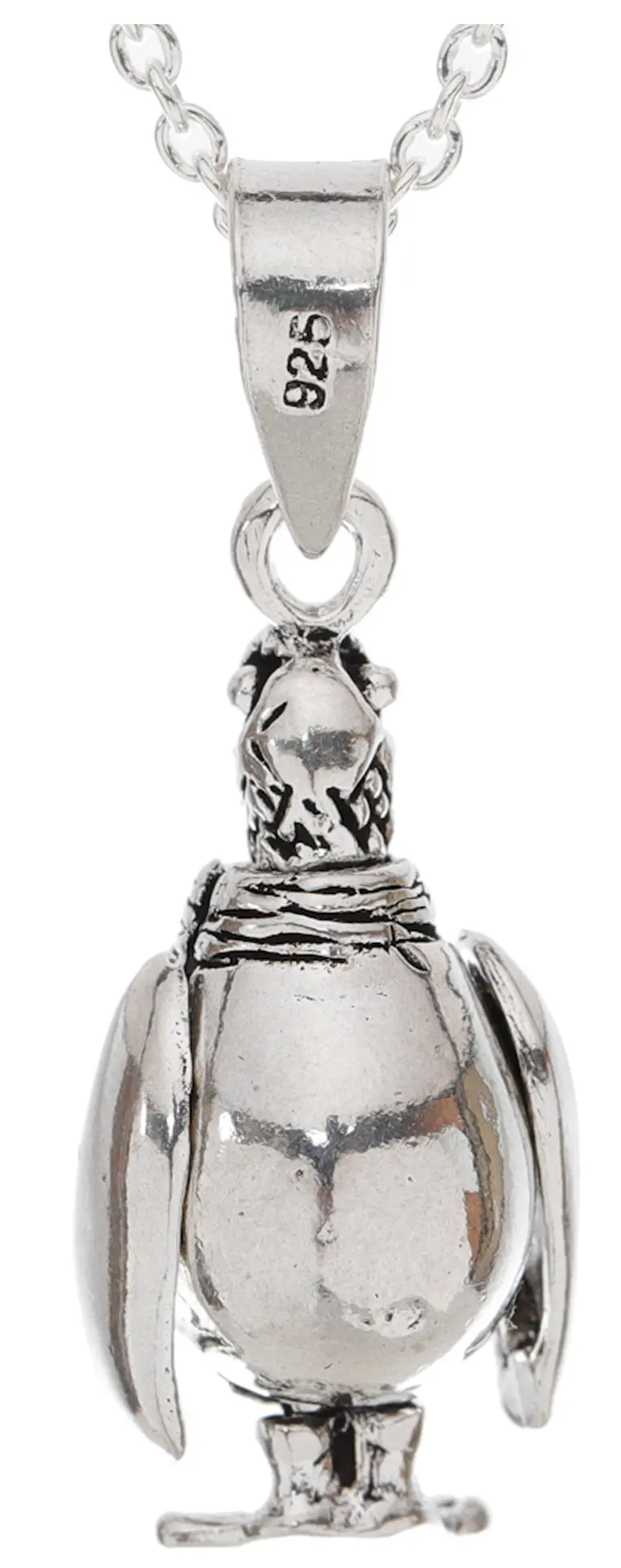 The design showcases the penguin in a characteristically plump posture, its body rounded and full, suggesting its resilience and charm. A finely sculpted scarf is draped around its neck, adding a touch of sophistication and a hint of playful personality. The texture of the sterling silver is expertly utilized to mimic the soft appearance of feathers, creating a tactile and visually engaging piece. The intricate details extend to the penguin's feet, which are firmly planted, giving the pendant a grounded and sturdy appearance.