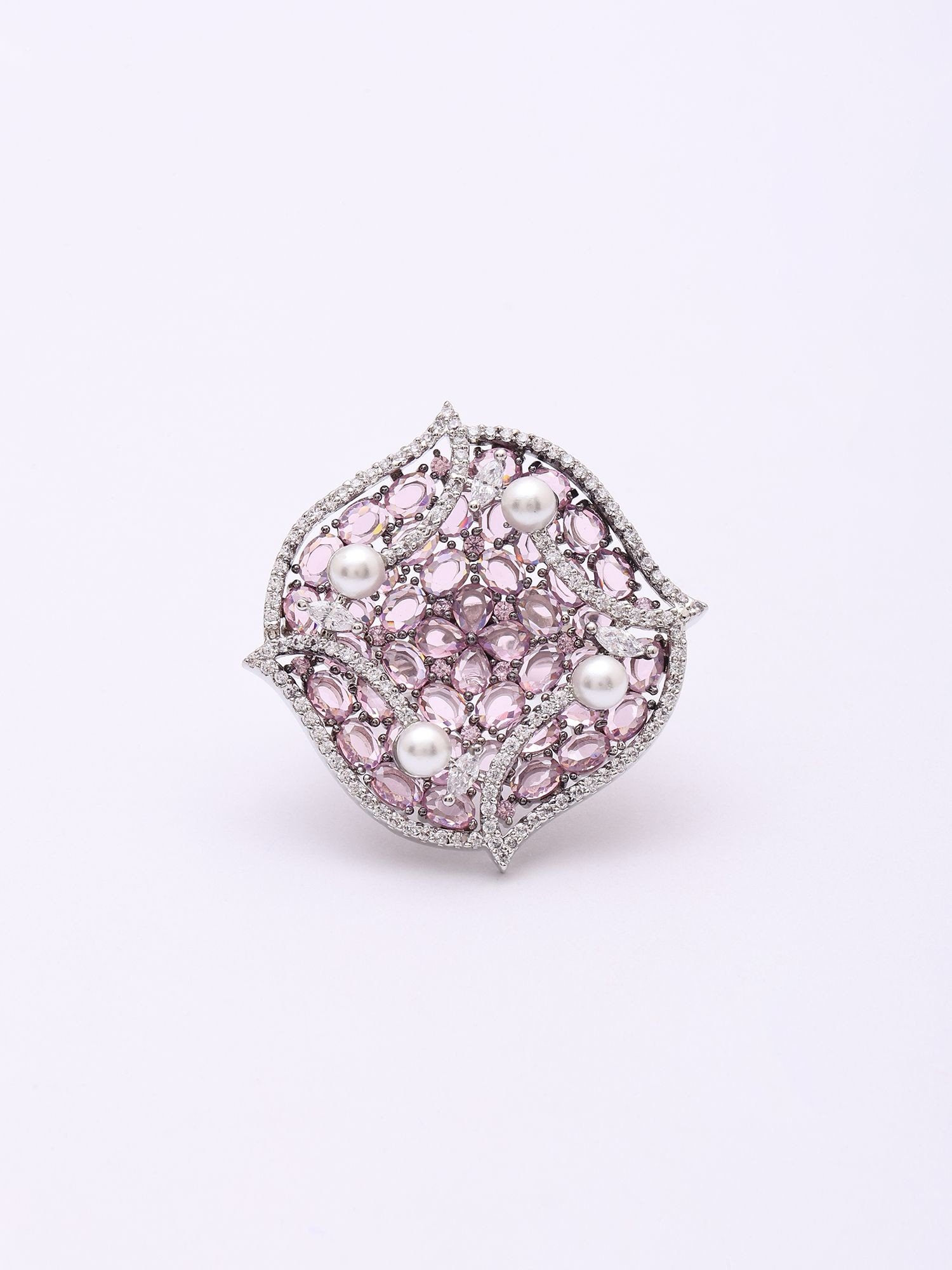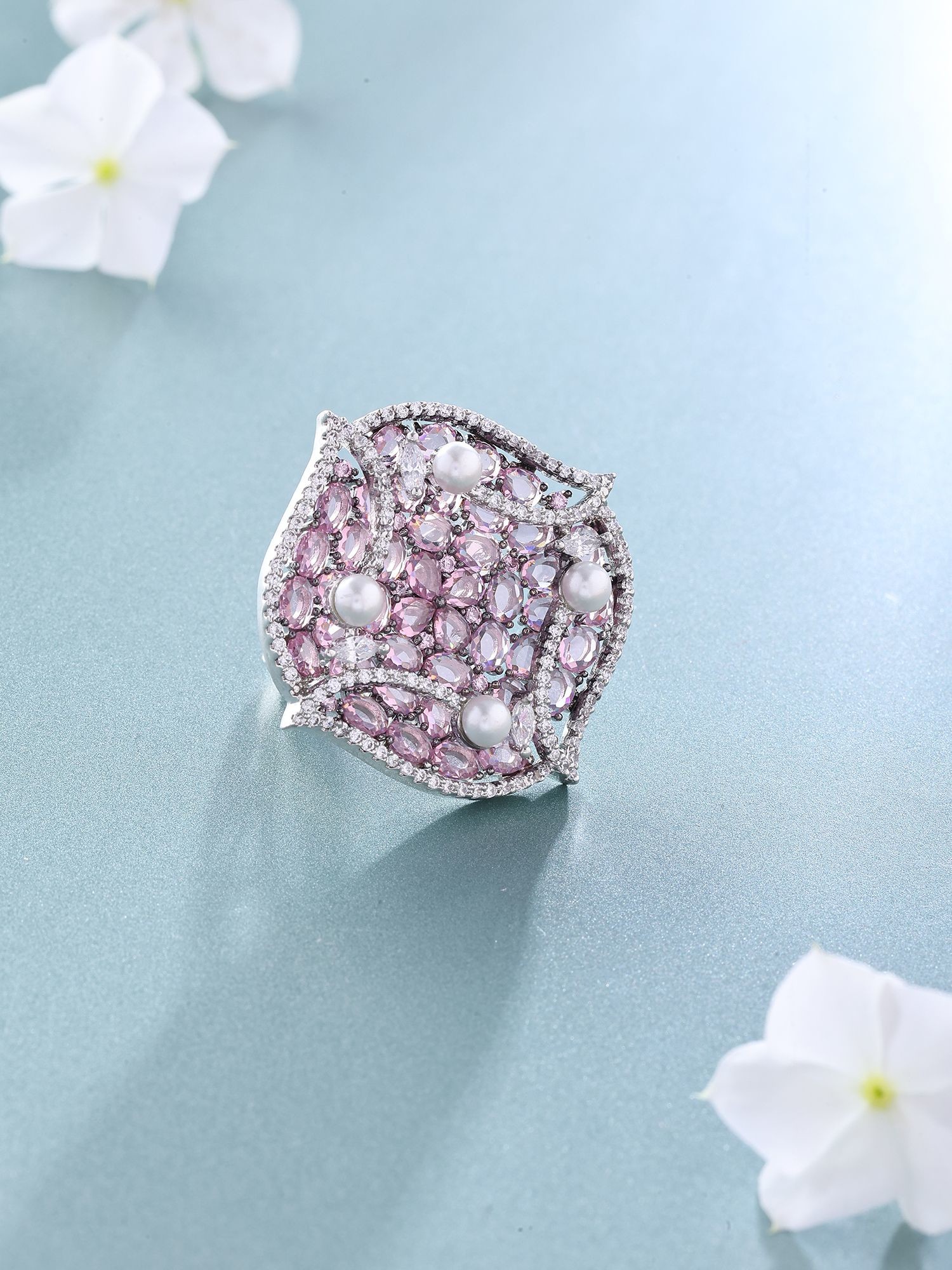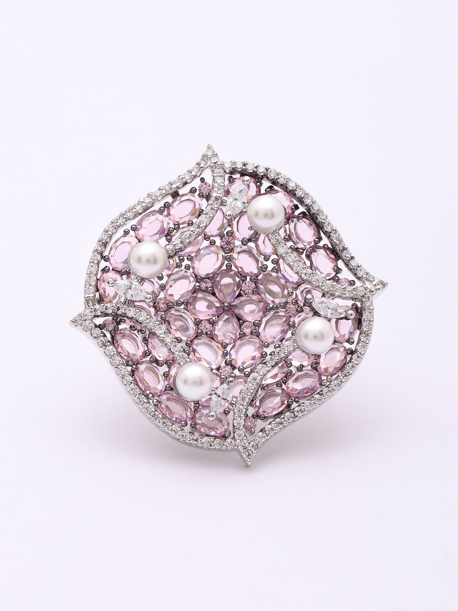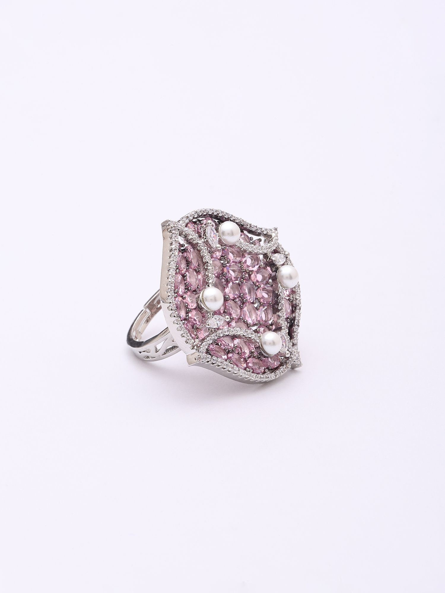 Pink American-Diamond Stone Studded Adjustable Ring with Pearl Detailing
