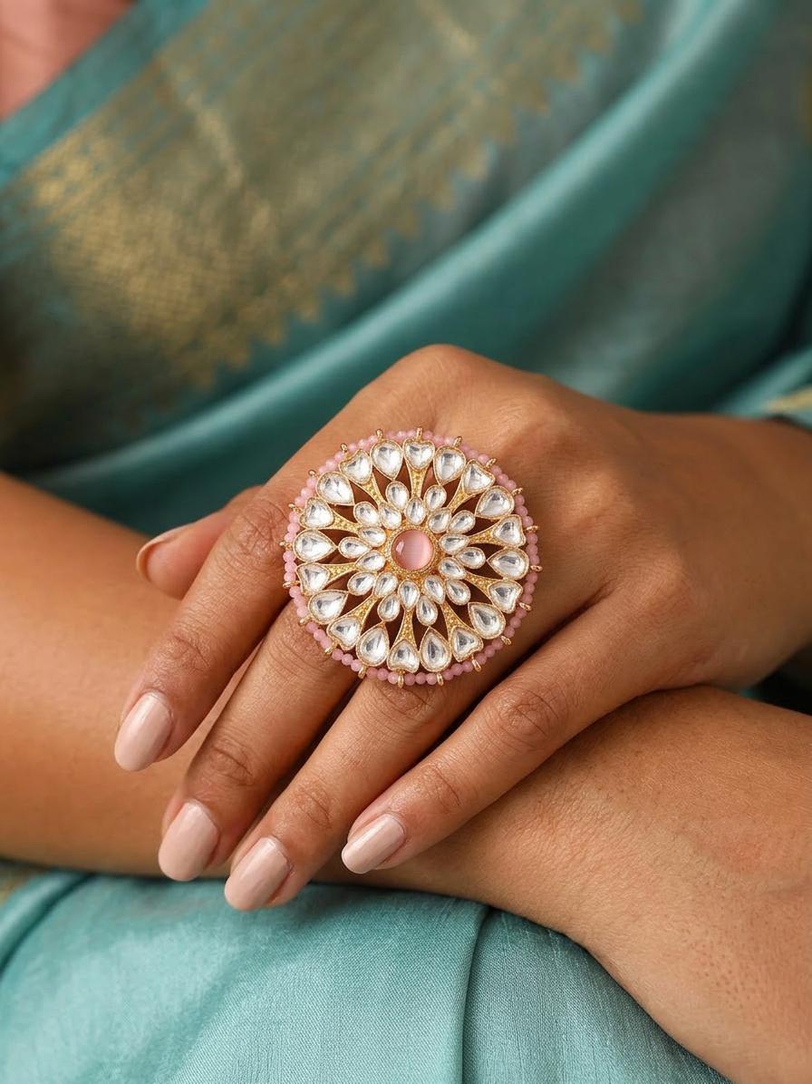 Pink Beaded Halo Polki Adjustable Statement Ring