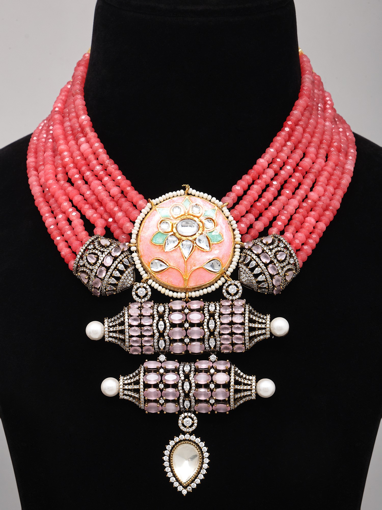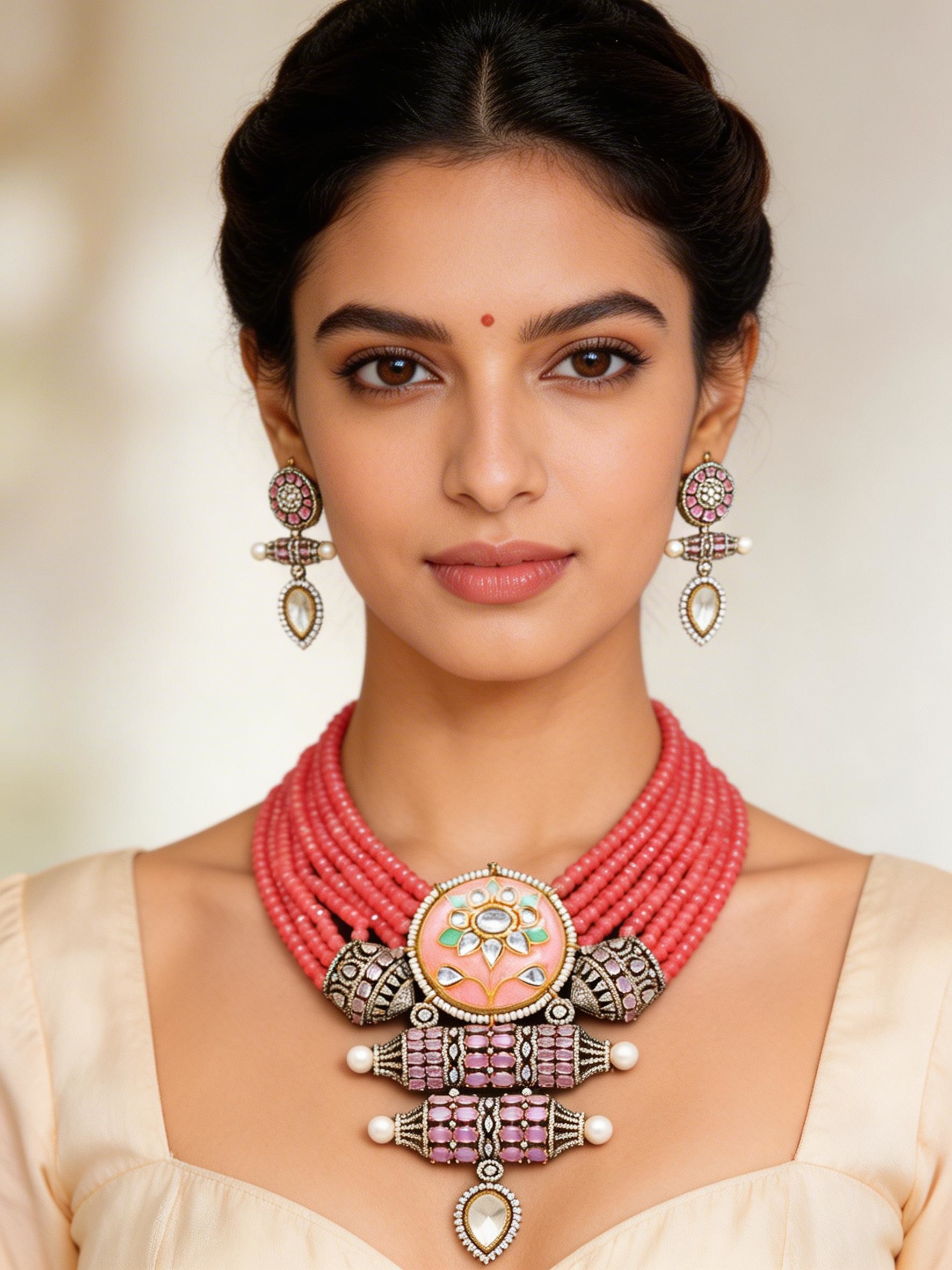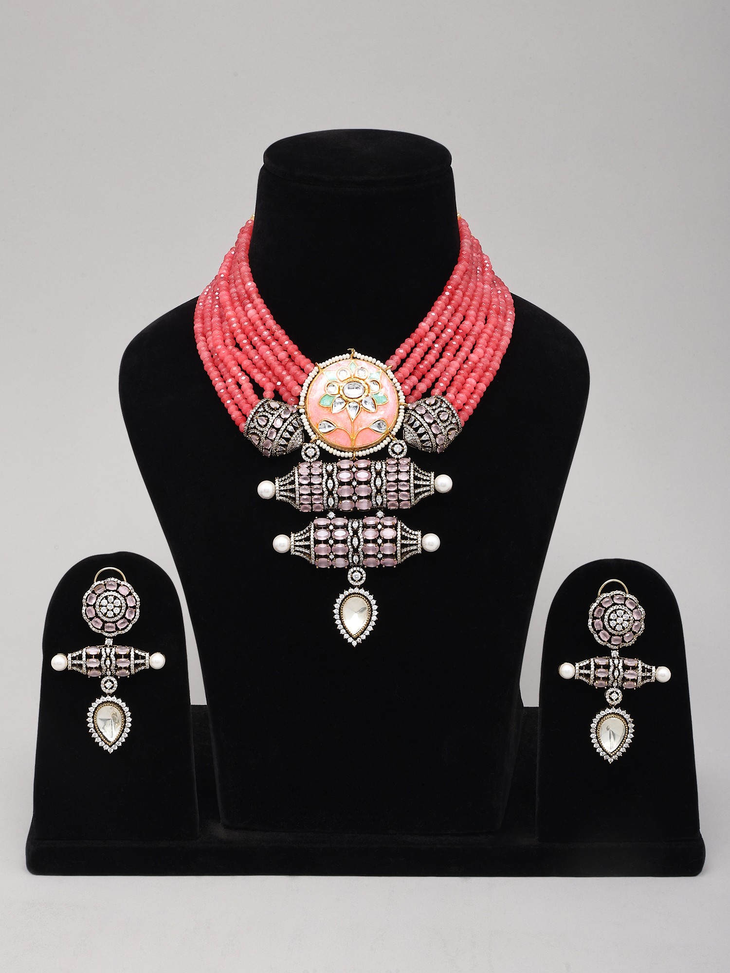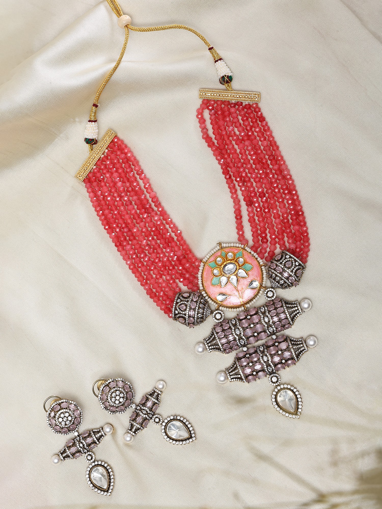 Pink Beaded Multi Strand Kundan Necklace and Earrings Set