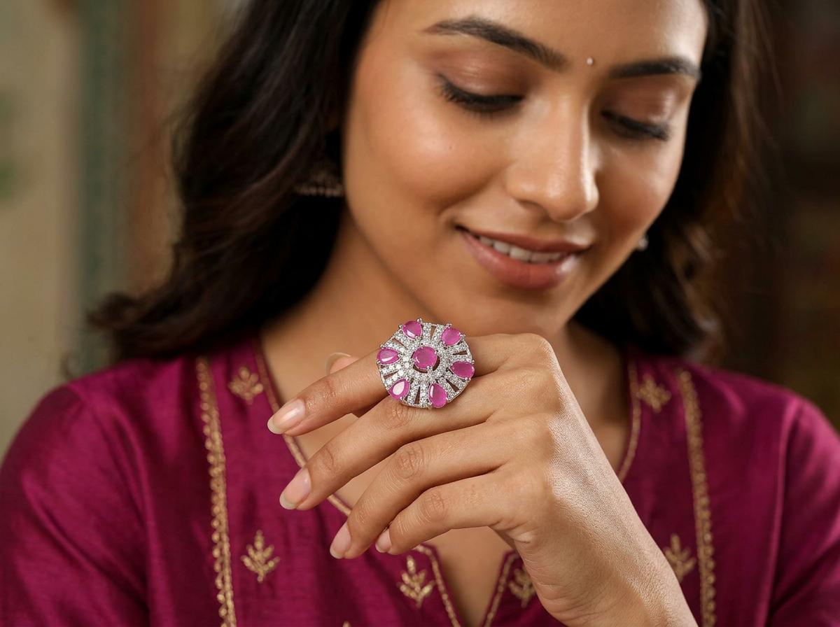 Crafted with meticulous attention to detail, this ring is a testament to artisanal skill. It is meticulously formed from lustrous brass, ensuring a durable and beautiful foundation. The centerpiece features a vibrant arrangement of pink stones, their facets expertly cut to catch and reflect light with every movement. Surrounding these are countless dazzling American diamonds, meticulously set to create an effect of pure, unadulterated sparkle, mimicking the brilliance of precious gems.
