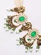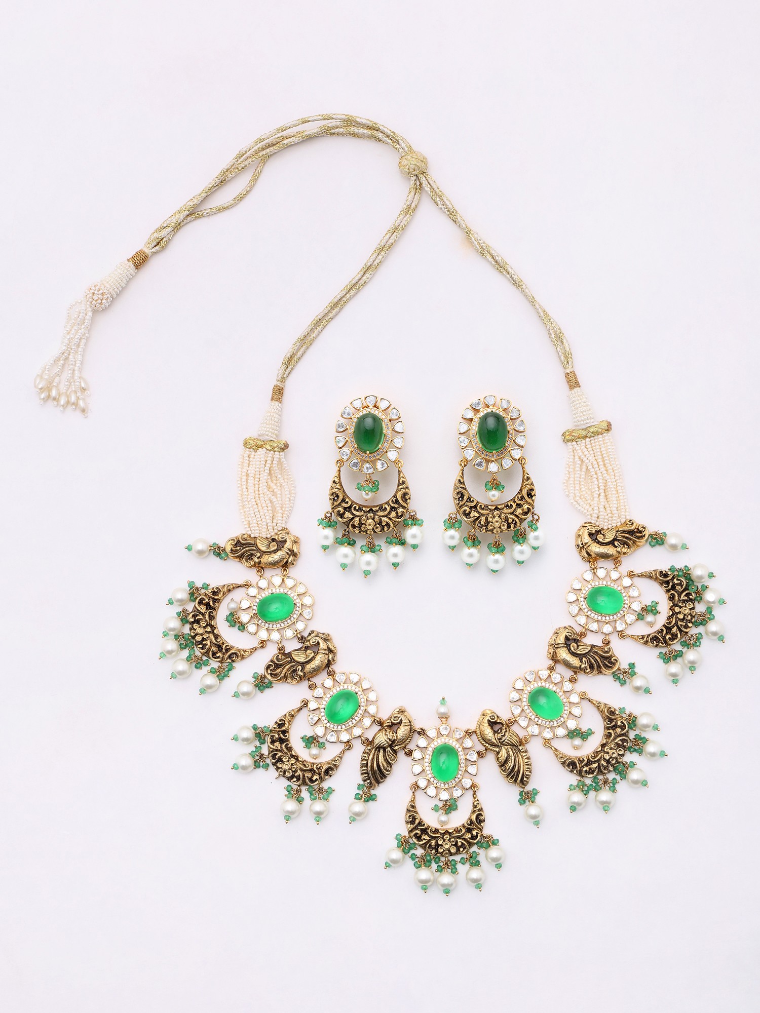 The necklace features a unique and striking construction, with the central peacock and green stone elements connected by delicate, ornate links. The adjustable cord, woven with threads of gold and silver, is finished with a traditional tassel of tiny pearls, adding a touch of delicate femininity and allowing for a customized fit. The matching earrings echo the design of the necklace, featuring the same oval green stones, Polki diamond accents, and the graceful crescent dangles. These earrings are designed to be statement pieces in their own right, completing the look with effortless grace. The interplay of the polished sterling silver, the vibrant green stones, and the creamy pearls creates a harmonious blend of colors and textures that is simply captivating.